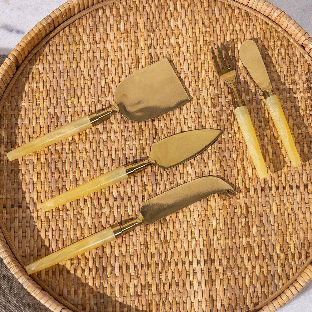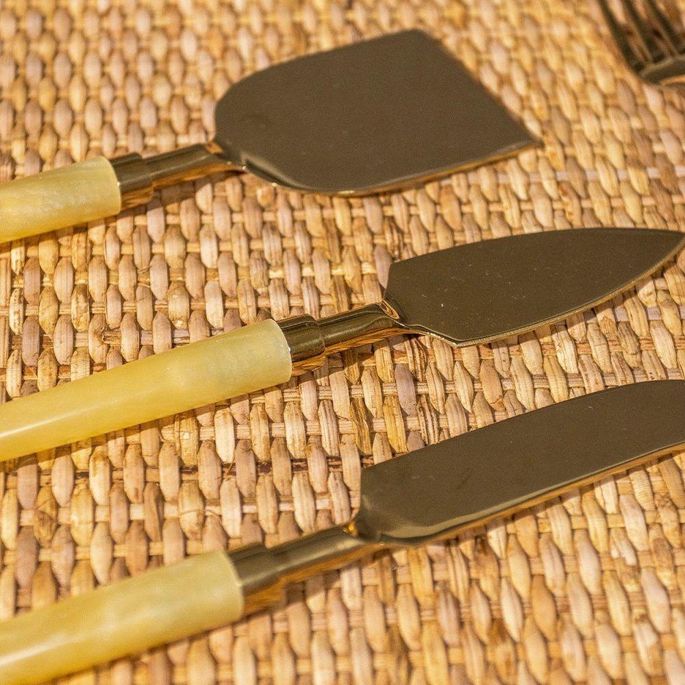 Conjunto De Talheres Copa E Cia Para Queijo 3 Peças Garbo TurimConjunto de Talheres Copa e Cia para Queijo 3 Peças Garbo Turim -Características Gerais do Produto: - Composição: Composição por linha de talheres:; Rattan: em aço inoxidável gold com cabo de rattan natural.; Atenas: em aço inoxidável gold com cabo de madrepérola.; Monza: em aço inoxidável silver com cabo de resina.; Goldwood: em aço inoxidável gold com cabo de madeira.; Turim: em aço inoxidável gold com cabo de resina.; Ilhéus: em aço inoxidável com cabo de resina.; Bamboo Natural: em aço inoxidável disponível nas versões gold ou silver, com cabo de bambu natural.; Bamboo: em aço inoxidável silver com cabo de bambu natural escuro.; Rattan Natural: em aço inoxidável silver com cabo de rattan. - Detalhes: Design Exclusivo Copa&Cia.; As cores podem sofrer pequenas alterações de cor, variando de monitor para monitor.; Os objetos que ambientam as fotos não acompanham o produto.; As fotos produzidas são apenas como sugestão de uso com as demais peças da coleção.; Cabo de Bamboo - Cuidados: O Atrito entre as Peças pode Danificar o Produto; Lavar com Detergente Neutro e Esponja Macia.; Não Deixar de Molho.; Armazenar em local seco e arejado.; Não podem ser colocados em lava-louças.; Não utilizar solventes, abrasivos ou alvejantes. - Dimensões (cm): Dimensão da Embalagem: Altura: 3 cm, Largura: 14 cm, Comprimento : 17,5 cmAcompanha o produto: - 3 Peças de Talheres para Queijo Garantia: - 7 dias/30 dias contra defeito de fabricação