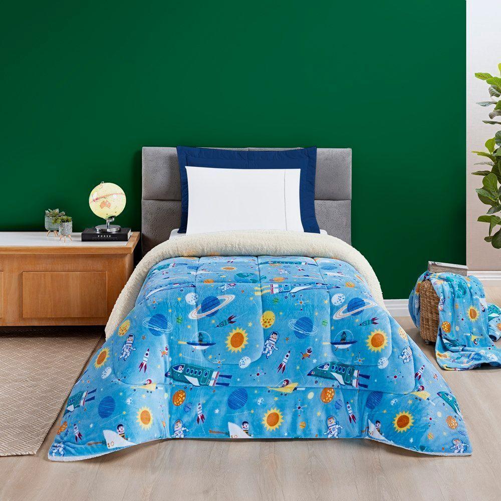 Kit Coberdrom + Jogo De Cama Bouti Kids Solteiro 03 Peças 100% Poliéster - Astronauta