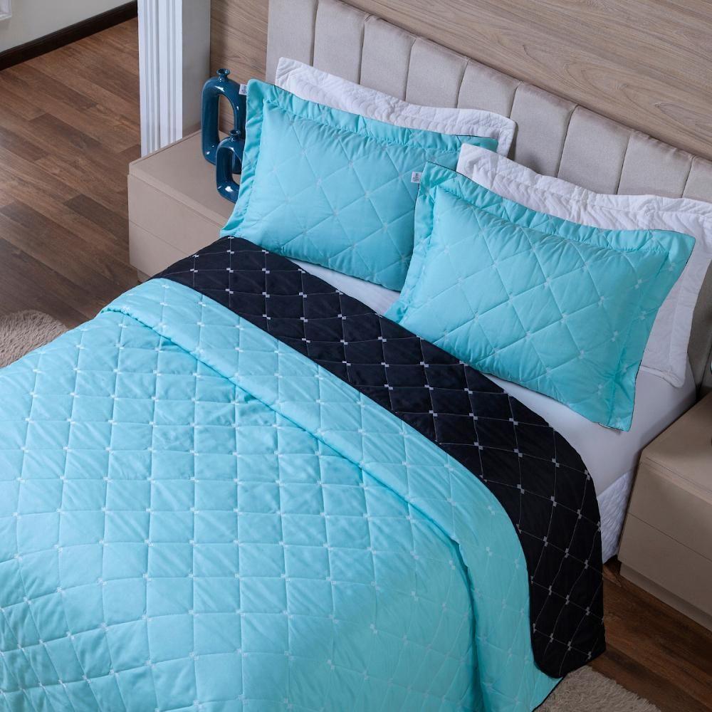 Kit Cobre Leito Dupla Face Casal King 3 Peças Bordado Essence Hipercal 400 Fios 100% Poliéster - Verde TiffanyTransforme seu quarto em um espaço de elegância e conforto com o Kit Cobre Leito Essence.Com design sofisticado e acabamento impecável, o conjunto traz um cobre leito bordado e porta-travesseiros com zíper invisível, posicionados na parte inferior para mais praticidade no dia a dia. Confeccionado em tecido Hipercal 400 Fios, o Essence proporciona toque suave, brilho delicado e alta durabilidade, ideal para quem busca um ambiente moderno e acolhedor sem abrir mão da qualidade.Conteúdo e Medidas Aproximadas:01 Cobre Leito Bordado King – 2,40m x 2,80m02 Porta-Travesseiros com Zíper e Debrum (3 lados) – 70cm x 50cm (medida útil)Composição:Tecido 100% Poliéster – Hipercal 400 FiosA tonalidade das cores pode variar conforme o monitor ou lote de tecido.Renove seu quarto com exclusividade e charme com o Kit Essence.