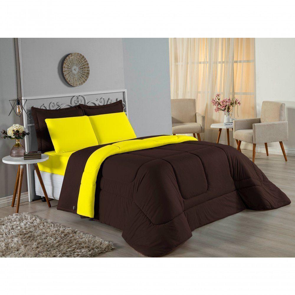 Edredom Queen Nobre 1 Peça Dupla Face 2,40m X 2,60m Malha 100% Algodão - Marrom / Amarelo