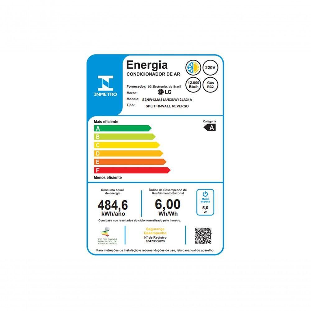 Ar-condicionado Lg Dual Inverter Voice +ai 12.000 Btu Quente/frioAI -- Inteligência Artificial: Aprende os hábitos de uso e configura automaticamente a temperatura, direção e velocidade do vento, Conectividade: Wi-Fi Integrado, pronto para usar. Compatível com LG ThinQ e comandos de voz do Google Assistente e Amazon Alexa, Função Controle de Energia 4 em 1: Permite reduzir o consumo de energia elétrica do ar-condicionado em 4 níveis, Compressor Dual Inverter: Gera até 70% de economia de energia, refrigeração até 40% mais rápida e é mais silencioso, Feito Para Durar: Proteção contra maresia com anticorrosivo GoldFin, proteção contra picos de energia de até 450V e gabinete de metalGERAL*Área de resfriamento est. (metros quadrados)N/AÁrea de aquecimento est. (metros quadrados)N/A*Capacidade de resfriamento nominal/min (W)3.517 / 879Capacidade de aquecimento nominal/mín. (W)3.517 / 880*Capacidade de resfriamento máx. (W)3.869Capacidade de aquecimento máx. (W)4.044*Consumo de energia de resfriamento nominal/mín. (W)1.130 / 150Potência de consumo de aquecimento nominal/mín. (W)1.030 / 150*Tensão nominal de entrada (V, Hz)220, 60Dimensões da unidade interna_LxAxP (mm)837 x 308 x 189*Dimensões da unidade externa_LxAxP (mm)717 x 495 x 230Tipo de RefrigeranteR32*Potência sonora (resfriamento) SH/H/M/L/SL (dB(A))N/APotência sonora (aquecimento) SH/H/M/L/SL (dB(A))N/A*Peso da unidade interna (kg)8,5Peso da unidade interna (lb)18,7*Peso da unidade externa (kg)22,8Peso da unidade externa (lb)50,3*Tipo do produto IIInverterTipo de Aquecimento, Ventilação e Ar CondicionadoQuente/Frio*Capacidade de refrigeração Nominal/Min. (BTU/h)12.000 / 3.000RESFRIAMENTO*Velocidade do ventilador6 posições4 viasAcima / baixo*Resfriamento potenteSimControle de fluxo de ar (acima/abaixo)Sim (6 posições)AQUECIMENTO*Aquecimento potenteSimFILTRO*Filtro de poeiraNão disponívelFiltro AntialérgicoSim*Pré-filtroSimFiltro de poeira finaNão disponívelECONOMIA DE ENERGIA*Economia de energia (resfriamento)Não disponívelMonitoramento de energiaNão disponível*Visor de EnergiaSimClasse de energiaA*Controle de Energia AtivoSimICA (I-Control Ampere)Não disponívelHIGIENIZAÇÃO*Limpeza automáticaSimPRATICIDADE*ThinQ (Wi-Fi)SimAlarme de FiltroNão disponível*Diagnóstico InteligenteSimControle remotoSim*Ligar/desligar reserva (24h)SimDetecção de corpo humanoNão disponível*Baixo ruídoSimControle de voz (dispositivo de terceiros)Não disponível*Modo VentiladorSimReinício automáticoSim*Operação de comutação forçadaSimDESUMIDIFICAÇÃO*Sensor de umidadeNão disponívelDesumidificaçãoNão disponívelUNIDADE EXTERNA*Nome do modelo da unidade externaS3UW12JA31ACONFORMIDADE*Tipo de produto e nome do modeloWall Mounted & S3-W12JA31ANome do modelo do produtoS3-W12JA31A*Mês de lançamento (AAAA-MM)2023-08Fabricante (importador)LG ElectronicsCÓDIGO DE BARRAS*Código de Barras8806084119766DESIGN*Cor (corpo)BrancoCor (descarga)BrancoGLOBAL_INTERNO*Nível de Pressão Sonora_Frio H (dB(A))42,0Nível de ruido (dB(A))37,0*Nível de Pressão Sonora_Frio L (dB(A))29,0Nível de Pressão Sonora_Frio SL (dB(A))22,0*Nível de Pressão Sonora_Quente e Frio H (dB(A))42,0Nível de Pressão Sonora_Quente e Frio M (dB(A))36,0*Nível de Pressão Sonora_Quente e Frio L (dB(A))31,0GLOBAL_CAPACIDADE*Resfriamento Máx. (Btu/h)13.200* VOCÊS FATURAM PARA B2B/CNPJ?Os produtos são vendidos para o consumidor final (CPF/B2C). Não realizamos vendas para Empresas (CNPJ/B2B).* EXISTE UMA LIMITAÇÃO PARA QUANTIDADE DE PRODUTOS COMPRADOS:Considerando que a venda é realizada para pessoas físicas (CPF/B2C), com o intuito de uso e consumo, o limite de compra é de até 10 (dez) produtos.* OS PRODUTOS SÃO ORIGINAIS?Sim, nós somos a loja oficial da LG no Brasil. Todos os produtos são originais e com nota fiscal.* VOCÊS ENVIAM NOTA FISCAL?Sim, todos os produtos são enviados com a Nota Fiscal.* É POSSÍVEL TROCAR?Não trabalhamos com o processo de troca do produto, mas é possível devolver a mercadoria, receber o reembolso e comprar novamente o produto desejado, desde que respeitadas as regras e prazos previstos no Código de Defesa do Consumidor.* OS PRODUTOS TEM GARANTIA?Sim, todos os produtos têm garantia da loja oficial da LG no Brasil.* QUAL O VALOR DO FRETE?O valor do frete é calculado automaticamente pelo canal de venda. Basta inserir o CEP de entrega no campo abaixo do valor do produto. Se não aparecer valor, o frete estará sem custo no período - aproveite!ANATEL_HOMOLOGATION_NUMBER - 13131204547Voltagem - 220vModelo - S3-W12JA31A.EB2GAM1Cor - Branco