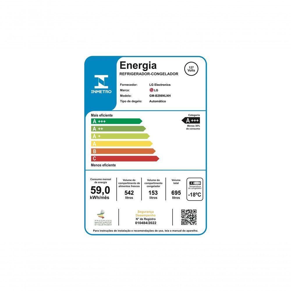 Geladeira LG French Door 695L Compressor Inverter GM-B298NLNH 110VPrincipais Características:Máxima Economia de EnergiaCompressor Linear InverterAlta CapacidadeDoor Cooling+Multi Air FlowDesign InovadorEspecificações Técnicas:Tipo de produto: French Door (3 portas)Profundidade padrão/de bancada: Profundidade padrãoPeso do produto: 120 KgPeso da embalagem: 8,5 KgDimensões do produto (LxAxP): 908 x 1 772 x 921 mmVisor LED interno: Display internoExpress Freeze: SimAcabamento (porta): P/S3Tipo de puxador: Alça vistaDuto de metal plano (metal fresco): NãoDispenser de água: NãoDispenser de gelo e água: NãoNome do modelo do filtro de água: LT1000PCMáquina de gelo automática: Sim (no gabinete, instalado de fábrica)Máquina de gelo dupla: NãoLuz do dispenser: NãoProdução diária de gelo (lb.): 2,5/3,0 (IcePlus)Capacidade do armazenamento de gelo (lb.): 10,0Máquina de gelo manual: NãoDoor-in-Door: NãoInstaView: NãoTipo de Compressor: Compressor Smart InverterThinQ (Wi-Fi): NãoDiagnóstico Inteligente: SimLuz do refrigerador: LED superiorHygiene Fresh+: NãoPrateleira de vidro temperado: 4 DivisõesPrateleira dobrável: NãoPrateleiras em balanço: NãoCesto de porta transparente: 6Gaveta de vegetais: Sim (2)Luz do Freezer: LED superiorGaveta do freezer: 2 não transparenteDivisória de gaveta SimGaveta conversível: NãoGaveta de conversão completa: NãoModelo: GM-B298NLNH.APZFSBSPerguntas Frequentes: Vocês faturam para B2B/CNPJ?Os produtos são vendidos para o consumidor final (CPF/B2C). Não realizamos vendas para Empresas (CNPJ/B2B).Existe uma limitação para quantidade de produtos comprados?Considerando que a venda é realizada para pessoas físicas (CPF/B2C), com o intuito de uso e consumo, o limite de compra é de até 10 (dez) produtos.Os produtos são originais?Sim, nós somos a loja oficial da LG no Brasil. Todos os produtos são originais e com nota fiscal.Vocês enviam nota fiscal?Sim, todos os produtos são enviados com a Nota Fiscal.É possível trocar?Não trabalhamos com o processo de troca do produto, mas é possível devolver a mercadoria, receber o reembolso e comprar novamente o produto desejado, desde que respeitadas as regras e prazos previstos no Código de Defesa do Consumidor.Os produtos tem garantia?Sim, todos os produtos têm garantia da loja oficial da LG no Brasil.Qual o valor do frete?O valor do frete é calculado automaticamente pelo canal de venda. Basta inserir o CEP de entrega no campo abaixo do valor do produto. Se não aparecer valor, o frete estará sem custo no período - aproveite!A Web Continental trabalha como um Agente de Vendas da LG. A Nota Fiscal e o envio do produto serão feitos pela LG.