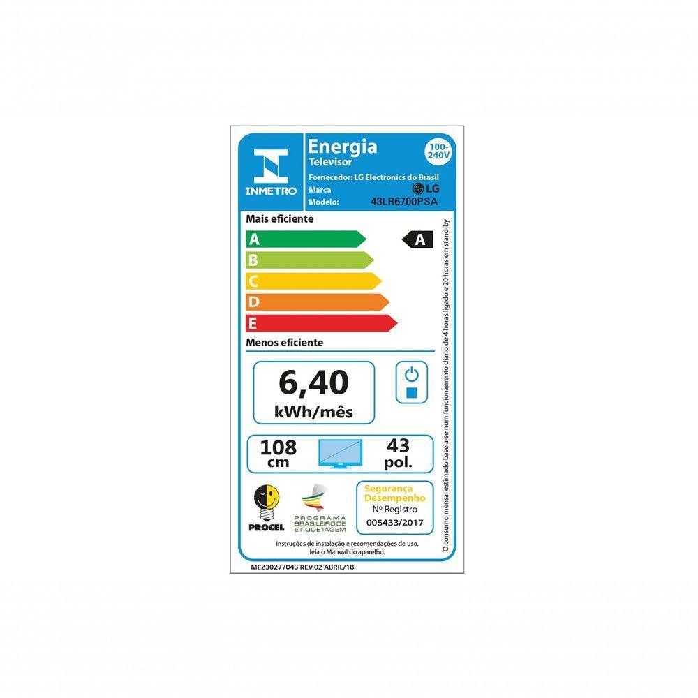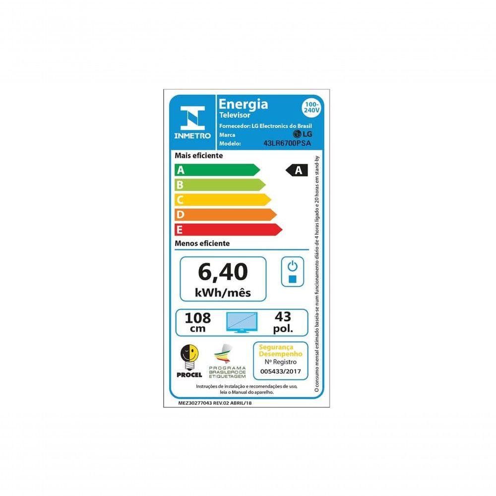 Smart TV LG Full HD de 43" 43LR67Principais Características- LG ThinQ AI- Compatível com Apple Home e Apple Airplay2- Recomendação AI- LG Channels- Alerta de EsportesEspecificações Técnicas:Fabricante: LG EletronicsModelo: 43LR6700PSATipo de Painel: FHDResolução: Full HD (1.920 x 1.080)Iluminação do painel: DiretoFrequência Nativa: 60Hz NativoProcessador: Processador AI α5 Ger6Upscaler AI: Upscaler de ResoluçãoDynamic Tone Mapping: SimAI Brightness Control: SimHDR (High Dynamic Range): HDR10 / HLGModo de Imagem: 8 modos (Vívido, Standard, Eco, Cinema, Esportes, Otimizador de Jogos, ISF Especialista (Modo Claro Dia), ISF Especialista (Modo Escuro Noite)HGIG Mode: SimOtimizador de Jogos: Sim (Painel de Jogos)Alto Contraste: SimEscada de Cinza: SimCores Invertidas: SimAI Sound: AI Sound (Virtual 5.1 Up-mix)Clear Voice Pro: Sim (Nivelamento automático de volume)LG Sound Sync: SimModo audio Compartido: SimSaída de Áudio Simultâneo: SimBluetooth Surround Ready: Sim (2 Way Playback)Saída de Áudio: 20WAI Acoustic Tuning: Compatível (controle Smart Magic vendido separadamente)Audio Codec: AC3(Dolby Digital), EAC3, HE-AAC, AAC, MP2, MP3, PCM, WMA, apt-X (vide manual)Direção do Som: InferiorSistema de Som: 2.0 CanaisRetorno de Canal de Áudio: eARC (HDMI 2)Bluetooth Support: Sim (V5.0)Ethernet: 1eaSimplink (HDMI CEC): SimSPDIF (Saída de Áudio Digital Óptica): 1eaEntrada HDMI: 2 (suporta eARC)Entrada de RF (Antena/Cabo): 1eaUSB: 1ea (v 2.0)Wi-Fi: Sim (Wi-Fi 5)Compatível com Apple Airplay2: SimSistema Operacional: webOS 23Configurações Família: SimLG ThinQ® AI: SimAmazon Alexa: Compatível (controle Smart Magic vendido separadamente)Web Browser Completo: SimReconhecimento Inteligente de Voz: Sim (com o aplicativo LG ThinQ.)Controle Smart Magic: Compatível (controle Smart Magic vendido separadamente)Compartilhamento entre Ambiente: Sim (Receptor)App de Controle pelo Smartphone: Sim (LG ThinQ)Voltagem: AC 100~240V 50-60HzConsumo de energia em stand by: Abaixo de 0,5WControle Remoto: Controle Remoto PadrãoCabo de Força: Sim (Destacável)Baterias do Controle Remoto: Yes (2 unid. AAA)Código de Homologação Anatel: 188302201925Código de Barras: 8806096004777Perguntas Frequentes: Vocês faturam para B2B/CNPJ?Os produtos são vendidos para o consumidor final (CPF/B2C). Não realizamos vendas para Empresas (CNPJ/B2B).Existe uma limitação para quantidade de produtos comprados?Considerando que a venda é realizada para pessoas físicas (CPF/B2C), com o intuito de uso e consumo, o limite de compra é de até 10 (dez) produtos.Os produtos são originais?Sim, nós somos a loja oficial da LG no Brasil. Todos os produtos são originais e com nota fiscal.Vocês enviam nota fiscal?Sim, todos os produtos são enviados com a Nota Fiscal.É possível trocar?Não trabalhamos com o processo de troca do produto, mas é possível devolver a mercadoria, receber o reembolso e comprar novamente o produto desejado, desde que respeitadas as regras e prazos previstos no Código de Defesa do Consumidor.Os produtos tem garantia?Sim, todos os produtos têm garantia da loja oficial da LG no Brasil.Qual o valor do frete?O valor do frete é calculado automaticamente pelo canal de venda. Basta inserir o CEP de entrega no campo abaixo do valor do produto. Se não aparecer valor, o frete estará sem custo no período - aproveite!A Web Continental trabalha como um Agente de Vendas da LG. A Nota Fiscal e o envio do produto serão feitos pela LG.