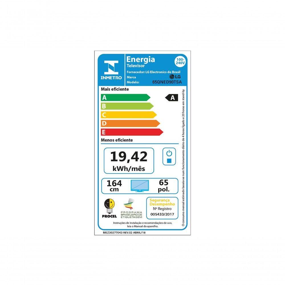Smart TV 4K LG QNED MiniLED QNED90 de 65" 2024Especificações Técnicas:Tipo de Painel: 4K QNED MiniLEDResolução: 4K Ultra HD (3.840 x 2.160)Iluminação do painel: Mini LEDFrequência Nativa: 120Hz NativoAmpla Gama de Cores: QNED Cores ProProcessador: Processador AI α8 4KUpscaler AI: α8 AI Super Upscaling 4KDynamic Tone Mapping: Sim (Dynamic Tone Mapping Pro)Seleção de Gênero AI: Sim (SDR/HDR)AI Brightness Control: SimHDR (High Dynamic Range): Dolby Vision / HDR10 / HLGFilmmaker Mode™: SimDimming Technology: Precision DimmingMotion: Motion ProModo de Imagem: 10 modos (Imagem Personalizada, Vivo, Padrão, Eco, Cinema, Esportes, Otimizador de Games, Filmmaker Mode, ISF Especialista (Espaço claro, dia), ISF Especialista (Espaço escuro, noite)HFR (High Frame Rate): 4K 120 fps (HDMI)Compatível com FreeSync (AMD): SimHGIG Mode: SimOtimizador de Jogos: Sim (Painel de Jogos)ALLM (Modo de Baixa Latência Automático): SimVRR (Taxa de Atualização Variável): SimAlto Contraste: SimEscada de Cinza: SimCores Invertidas: SimDimensões sem base (LxAxP): 1452 x 839 x 44,9Dimensões com base (LxAxP): 1452 x 904 x 295Dimensões da embalagem (LxAxP): 1600 x 970 x 172Base da TV (LxAxP): 1165(425) x 295Peso sem base: 31,0Peso com base: 31,4Peso da embalagem: 38,0Suporte Vesa (LxA): 400 x 400Código de Barras: 7893299946318Dolby Atmos: SimAI Sound: α8 AI Sound Pro (Som virtual 9.1.2)Clear Voice Pro: Sim (Nivelamento automático de volume)WiSA Ready: Sim (Até 2.1 Canais)LG Sound Sync: SimModo audio Compartido: SimSaída de Áudio Simultâneo: SimBluetooth Surround Ready: Sim (2 Way Playback)Saída de Áudio: 40WAI Acoustic Tuning: SimAudio Codec: AC4, AC3 (Dolby Digital), EAC3, HE-AAC, AAC, MP2, MP3, PCM, WMA, apt-X (vide manual)Direção do Som: InferiorSistema de Som: 2.2 CanaisRetorno de Canal de Áudio: eARC (HDMI 3)Bluetooth Support: Sim (v. 5.1)Ethernet: 1eaSimplink (HDMI CEC): SimSPDIF (Saída de Áudio Digital Óptica): 1eaEntrada HDMI: 4 (suporta 4K 120Hz, eARC, VRR, ALLM e Quick Media Switch)Entrada de RF (Antena/Cabo): 1eaUSB: 2ea (v 2.0)Wi-Fi: Sim (Wi-Fi 5)Compatível com Airplay2: SimSistema Operacional: webOS 24Configurações Família: SimLG ThinQ® AI: SimCompatível com Câmera USB: SimAlways Ready: SimWeb Browser Completo: SimReconhecimento Inteligente de Voz: SimControle Smart Magic: Built-In (Integrado)Multi View: SimCompartilhamento entre Ambiente: Sim (Receptor)App de Controle pelo Smartphone: Sim (LG ThinQ)Voltagem: AC 100~240V 50-60HzConsumo de energia em stand by: Abaixo de 0,5WControle Remoto: Controle Smart Magic MR24Cabo de Força: Sim (Anexo)Baterias do Controle Remoto: Sim (2 unid. AA)