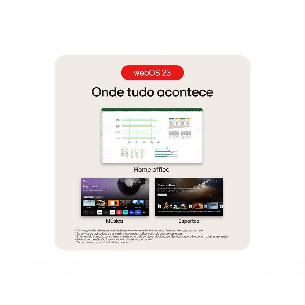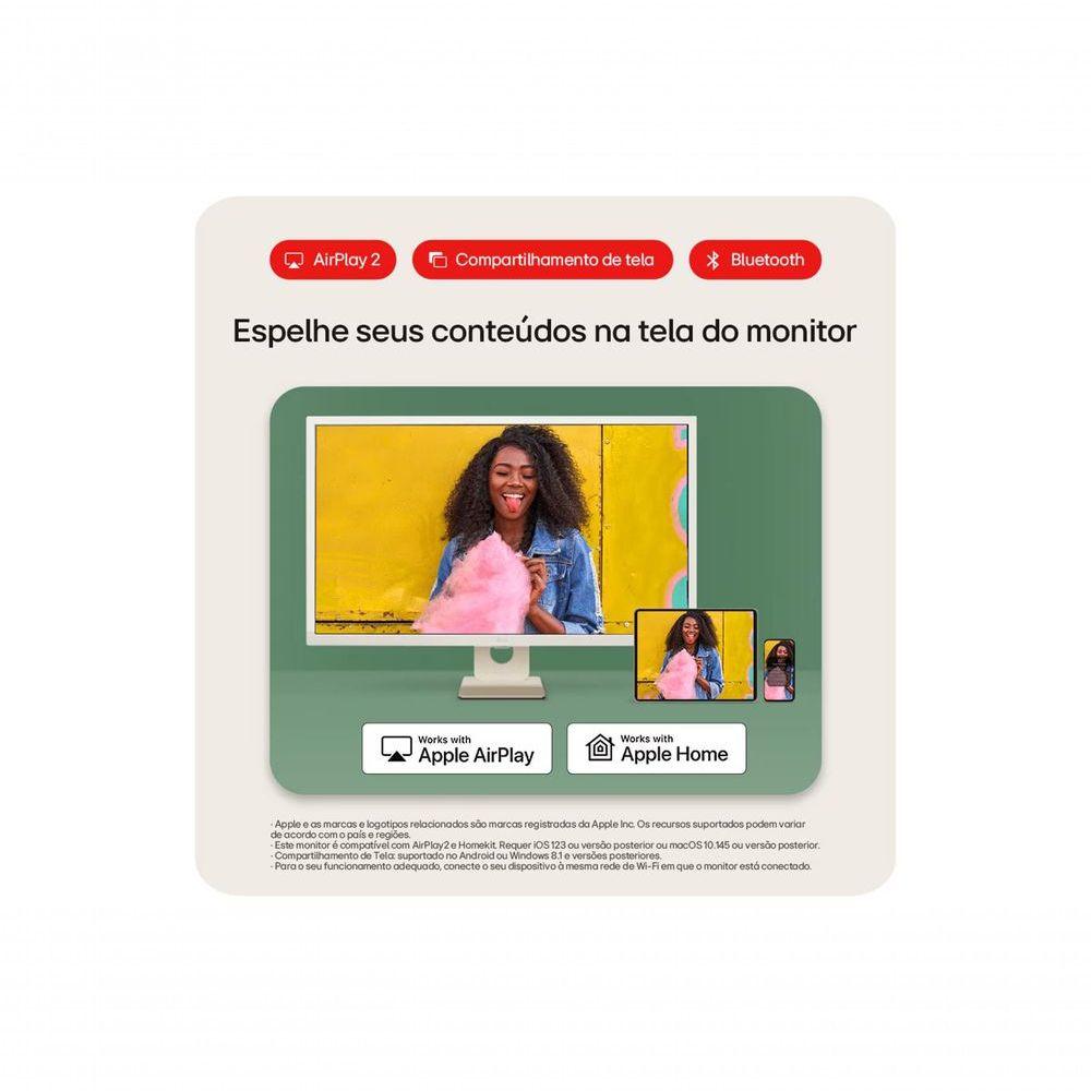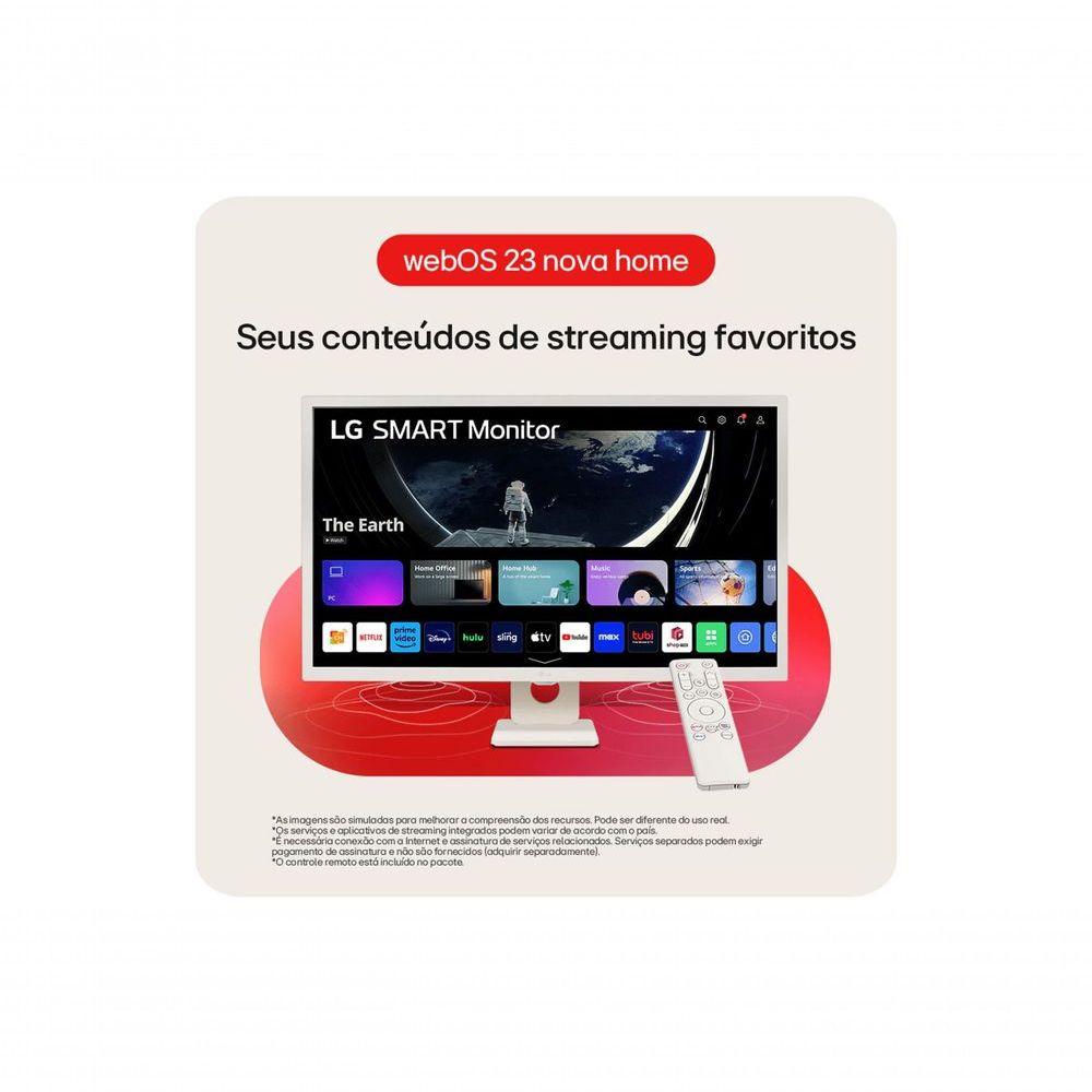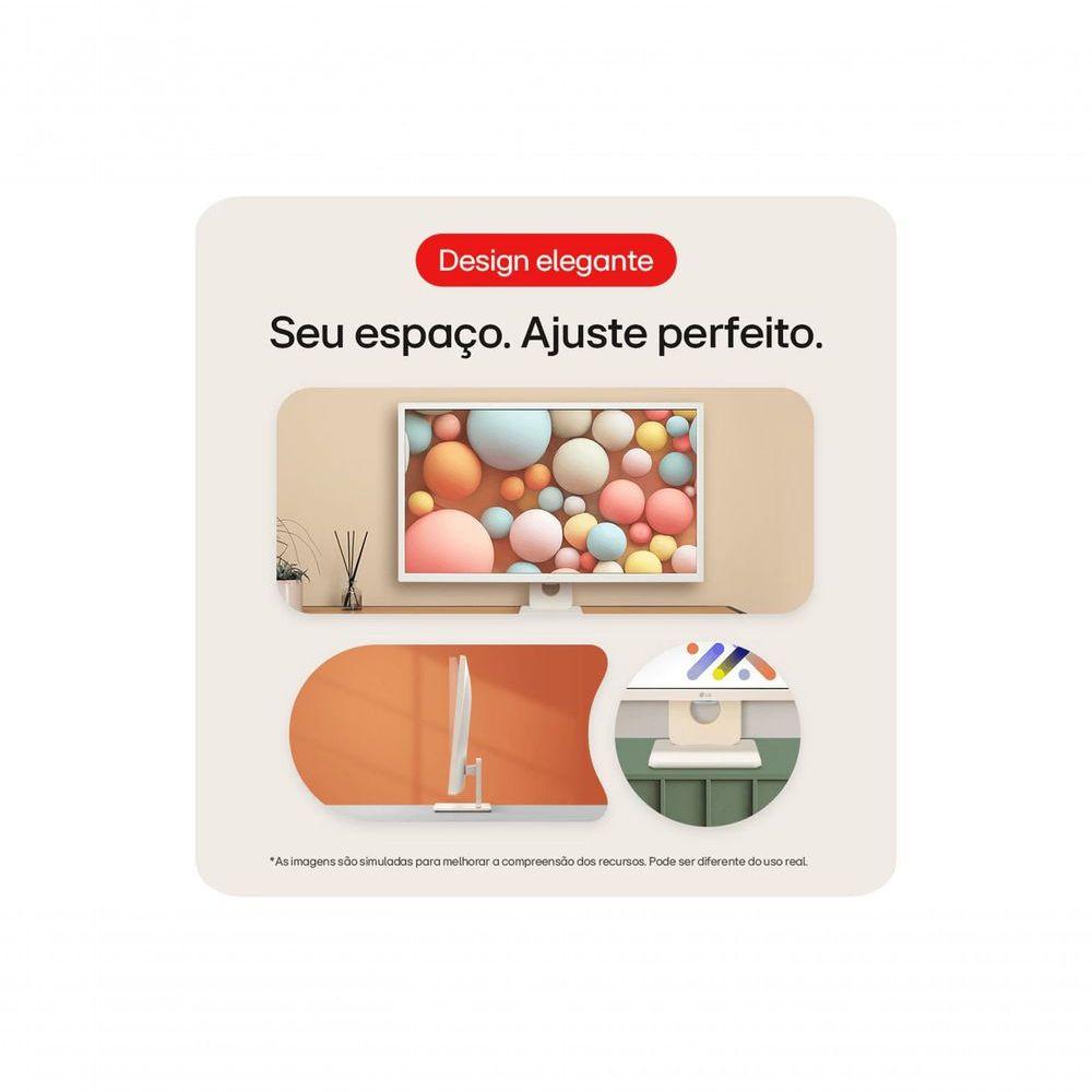 Monitor LG Myview Smart Tela IPS 32'' Fhd Webos Screen Share HDR10 Thinq Air Play 2 Bluetooth USB HDMI 32SR50F-W Especificações Técnicas:- Modelo: 32SR50F-W- Cor: Branco- Tela: IPS de 32”- Código de Vendas: 32SR50F-W.AWZM- Tamanho: 32”- Tipo de Tela: IPS- Ângulo de Visão: 178º (R/L) / 178º (U/D)- Resolução Máxima: 1920 x 1080- Brilho: 250 cd/m² (típ.)- Contraste: 1200:1 (típ.)- Tempo de Resposta: 8ms- Taxa de Atualização: 60Hz- Gama de cores: sRGB 99% (CIE1931)- Profundidade de Cores (nº de cores): 16.7M- Distância entre pixels: 0.363 x 0.363 mm- HDMI: Sim (2ea)- USB-A: 2.0 (2ea)- Consumo de Energia: 30W (típ.)- Fonte: Adaptador externo- AC Input: 100~240V (50/60Hz)- DC Output: 19V, 2.53A- Fonte de alimentação: Sim- Cabo HDMI: Sim- Controle remoto: Sim- Ajustes de Posição: Inclinação (-5º ~ 15º)- Tamanho da Furação: 100 x 100 mm- Dimensões com base (L x A x P): 731.8mm X 521.2mm X 209.9mm- Dimensões sem base (L x A x P): 731.8mm X 440.5mm X 45.0mm- Dimensões Embalagem (L x A x P): 892mm X 131mm X 517mm- Peso com base: 6.6kg- Peso sem base: 5.4kg- Peso Embalagem: 9Kg- Auto Falante: Sim (5W x2 )- Virtual Surround: Sim- Smart webOS 23: Sim- Screen Share (Miracast & WiDi): Sim- Plug & Play: Sim- Air Play 2: Sim- HDCP: Sim- HDR: HDR 10- Brilho Automático: Sim- Bluetooth: Sim- Flicker Safe: Sim- Black Stabilizer: Sim- Dynamic Action Sync: Sim- Gaming Mode: Sim- Execução Automática USB: Sim- Reprodutor de Mídia (UBS): Sim- Economia Inteligênte de Energia: Sim- NCM: 85285200- CEST: 2106800- Código EAN: 7893299945724- Portaria: Portaria Interministerial ME/MCTI nº 58, de 9 de outubro de 2020.- Tipo de uso: Monitor- Tipo de produto: Monitor- Consumo de energia: 30W- Tamanho da Tela: 32- Voltagem: 110V/220V- Modelo: 32SR50F-W- Cor: Branco- Garantia: 12 meses