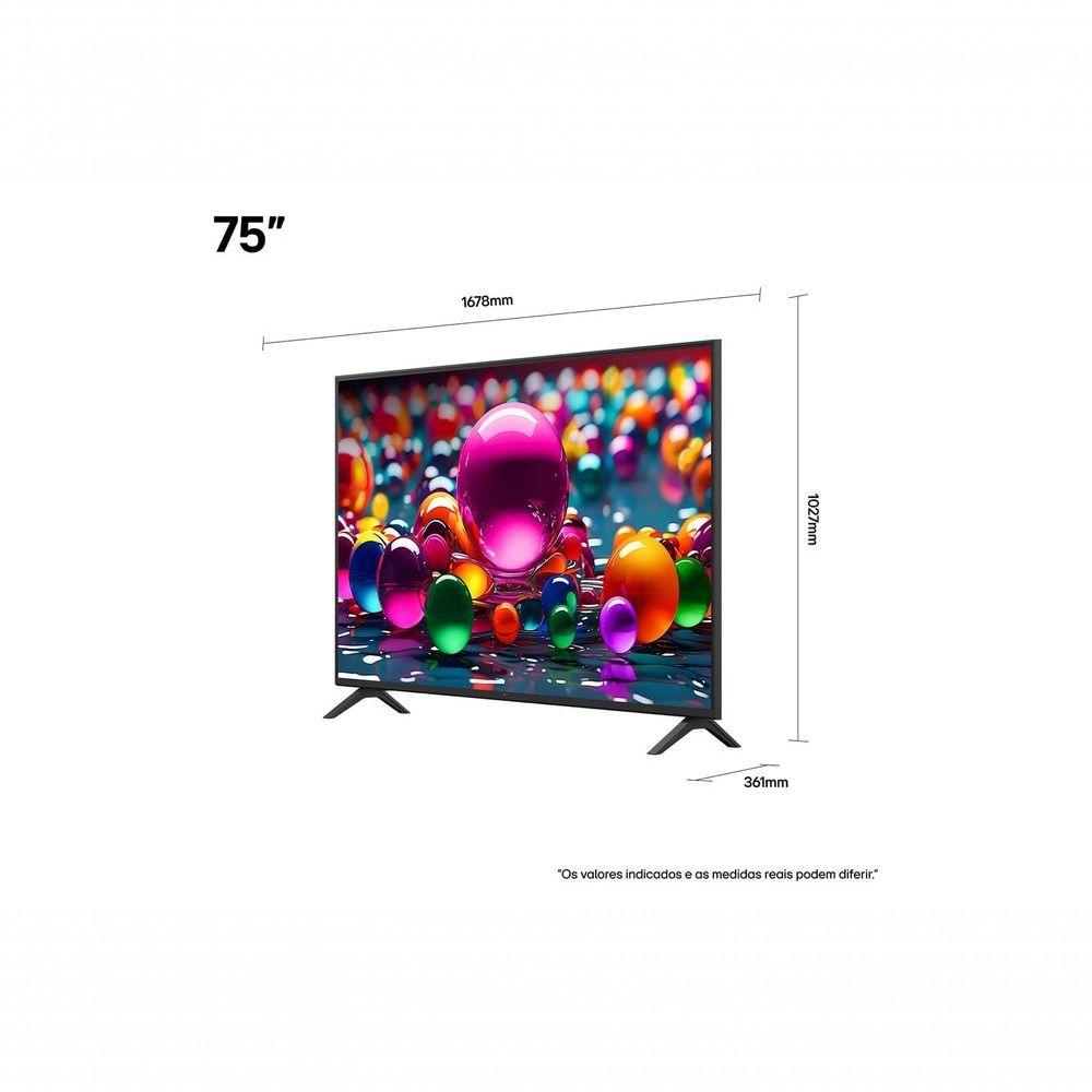 Smart LG 75 Tela Gigante WebOS 25 HDR10 Pro 75UA8550PSA BivoltPrincipais Recursos:Cores e detalhes de tirar o fôlego com o 4K HDR10 ProQualidade de imagem 4K, visual aprimorado e áudio surround com o processador alpha 7 4K AI Gen8 botão AI, controles de voz, funções de arrastar e soltar no AI Magic RemoteAproveite a resolução, o brilho e a clareza aprimorados do 4K Super UpscalingAlta resolução em uma enorme tela de ultragrandeEspecificações Técnicas:Controle Remoto: Controle Remoto Smart Magic MR25Cabo de Força: Sim (Anexo)Tipo de Painel: 4K UHDResolução: 4K Ultra HD ( x Iluminação do painel: DiretoFrequência Nativa: 60Hz NativoProcessador: α7 AI Processor 4K Gen8Upscaler AI: 4K Super UpscalingHDR (High Dynamic Range): HDR10 / HLGFilmmaker Mode: SimDynamic Tone Mapping: SimModo de Imagem: 10 modosSistema Operacional: webOS 25Reconhecimento Inteligente de Voz: SimControle Smart Magic: Built-In (Integrado)App de Controle pelo : Sim (LG ThinQ)Web Browser Completo: SimLG Channels: Sim com Câmera USB: Sim com Home: SimHome Hub: SimAI Chatbot: SimReconhecimento de Voz: Sim Home / Hub: Sim Cast: Sim com Airplay: SimEntrada HDMI: 3 (suporta eARC, ALLM)Simplink (HDMI CEC): Sim de de Áudio: eARC (HDMI 2)USB: 2ea (v Wi-Fi: Sim (Wi-Fi 5)Bluetooth Support: Sim (v. Ethernet: 1eaEntrada de RF (Antena/Cabo): 1eaSPDIF (Saída de Áudio Digital Óptica): 1eaDimensões sem base (LxAxP): 1678 x 964 x 59,9Dimensões com base (LxAxP): 1678 x 1027 x 361Dimensões da embalagem (LxAxP): 1820 x 1150 x 200Base da (LxAxP): 1344 x 361Peso sem base: 31,4Peso com base: 31,8Peso da embalagem: 40,7Suporte Vesa (LxA): 400 x 400Código de Barras: 7893299000140Voltagem: AC 100~240V 50-60HzConsumo de energia em stand by: Abaixo de 0,5WPerguntas Frequentes: Vocês faturam para B2B/CNPJ?Os produtos são vendidos para o consumidor final (CPF/B2C). Não realizamos vendas para Empresas (CNPJ/B2B).Existe uma limitação para quantidade de produtos comprados?Considerando que a venda é realizada para pessoas físicas (CPF/B2C), com o intuito de uso e consumo, o limite de compra é de até 10 (dez) produtos.Os produtos são ?Sim, nós somos a oficial da LG no . Todos os produtos são e com .Vocês enviam ?Sim, todos os produtos são enviados com a .É possível trocar?Não trabalhamos com o processo de troca do produto, mas é possível a mercadoria, receber o e comprar novamente o produto desejado, desde que respeitadas as regras e prazos previstos no Código de Defesa do Consumidor.Os produtos tem garantia?Sim, todos os produtos têm garantia da oficial da LG no .Qual o valor do ?O valor do é calculado automaticamente pelo de venda. Basta inserir o CEP de no campo abaixo do valor do produto. Se não aparecer valor, o estará sem custo no período aproveite!A Web Continental trabalha como um Agente de Vendas da LG. A e o do produto serão feitos pela LG.