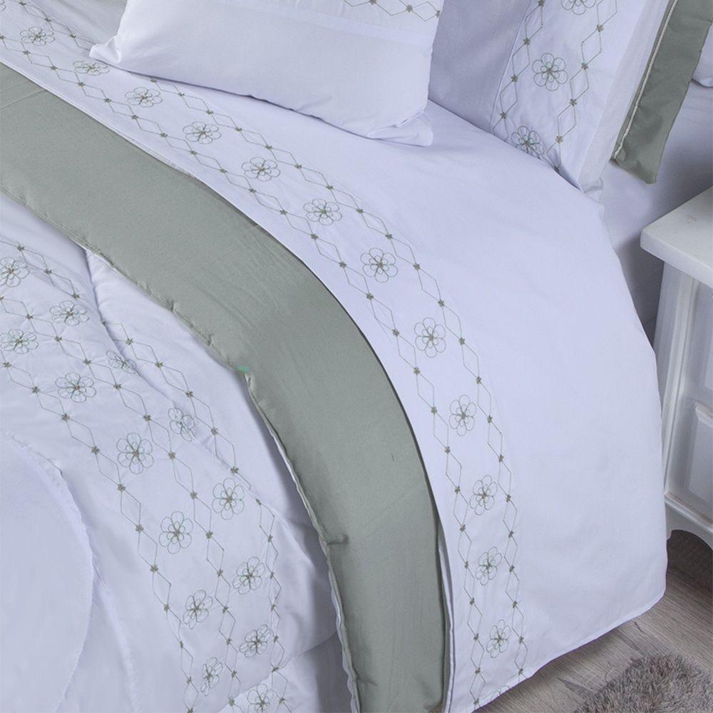 Edredom + Jogo De Cama 200 Fios Damasco King 15 Peças 100% Poliéster - Branco/cinzaEleve o nível de sofisticação do seu quarto com o Kit Cama Completa Damasco King. Desenvolvido para quem busca o máximo de conforto, este conjunto une o elegante edredom bordado com o luxuoso jogo de lençol. Confeccionado em tecido micropercal 200 fios, o kit se destaca pelo toque macio e acabamento primoroso, vestindo a cama king com perfeição.Por que o Kit Damasco King é a escolha perfeita?Sofisticação Coordenada: O delicado trabalho bordado está presente no edredom, nos porta travesseiros, na vira do lençol de cima e nas fronhas, criando um visual de luxo e harmonia.Kit Cama Ultra Completo (15 Peças): Uma solução definitiva que veste sua cama da base ao topo, incluindo edredom, jogo de cama completo e um conjunto de almofadas decorativas com refil.Toque Premium: Todo o conjunto é feito em micropercal 200 fios, garantindo uma sensação de toque suave, macio e sedoso.Composição Múltipla para Travesseiros: O kit é rico em detalhes, contando com 02 porta travesseiros bordados, 02 porta travesseiros lisos e 02 fronhas bordadas, permitindo uma cama cheia e suntuosa.Ajuste Perfeito: O lençol de baixo possui elástico e é compatível com colchões king de até 35cm de altura, garantindo que fique sempre no lugar.Produto composto por (Total 15 Peças):Do Kit Edredom (11 Peças):01 Edredom 2,80m x 2,60m02 Porta Travesseiros Bordados 70cm x 50cm02 Porta Travesseiros Lisos 70cm x 50cm02 Capas de Almofadas Bordadas 45cm x 45cm01 Capa de Almofada Lisa 45cm x 45cm03 Refis de Almofadas 45cm x 45cmDo Jogo de Cama (04 Peças):01 Lençol de Cima 2,80m x 2,75m01 Lençol de Baixo com elástico para colchão de 2,03m x 1,93m x 35cm alt.02 Fronhas 70cm x 50cmComposição:Tecido (Todas as peças): 100% poliéster - micropercal 200 fiosEnchimento (Edredom, Porta Travesseiros e Refis de Almofadas): 100% poliésterAtenção: As cores do produto podem apresentar pequenas variações de acordo com as configurações da tela do seu dispositivo.