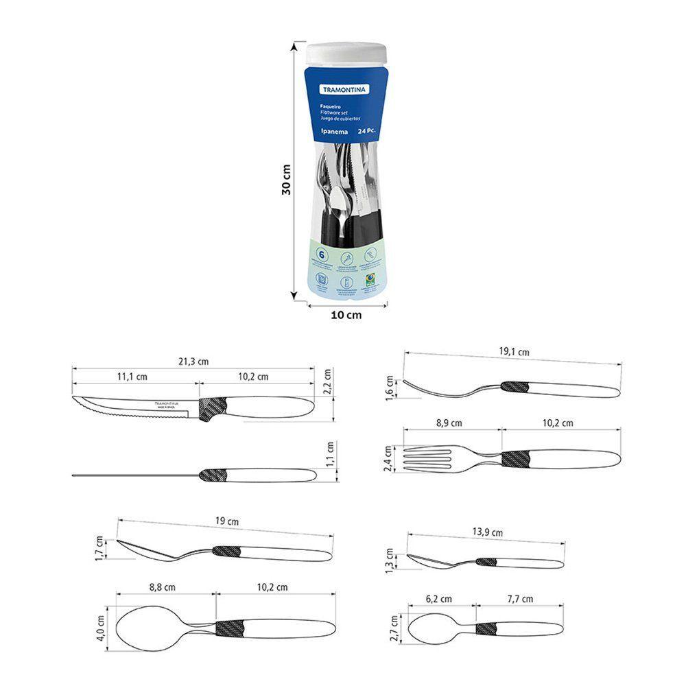 Jogo De Talheres 24 Peças Tramontina Ipanema 23399091 PretoJogo de Talheres 24 Peças Tramontina Ipanema 23399091 Preto -Características Gerais do Produto:Material: Aço Inox e PolipropilenoLinha: IpanemaPegador / Cabo: PolipropilenoPode ir à Maquina de Lavar Louças?: SimTratamento do Talher: Facas com tratamento térmicoAcompanha o produto: - 6 Colheres de Mesa6 Colheres para Chá 6 Facas para Churrasco 56 Garfos de Mesa1 Pote Plástico Garantia: - 90 dias junto ao fabricante