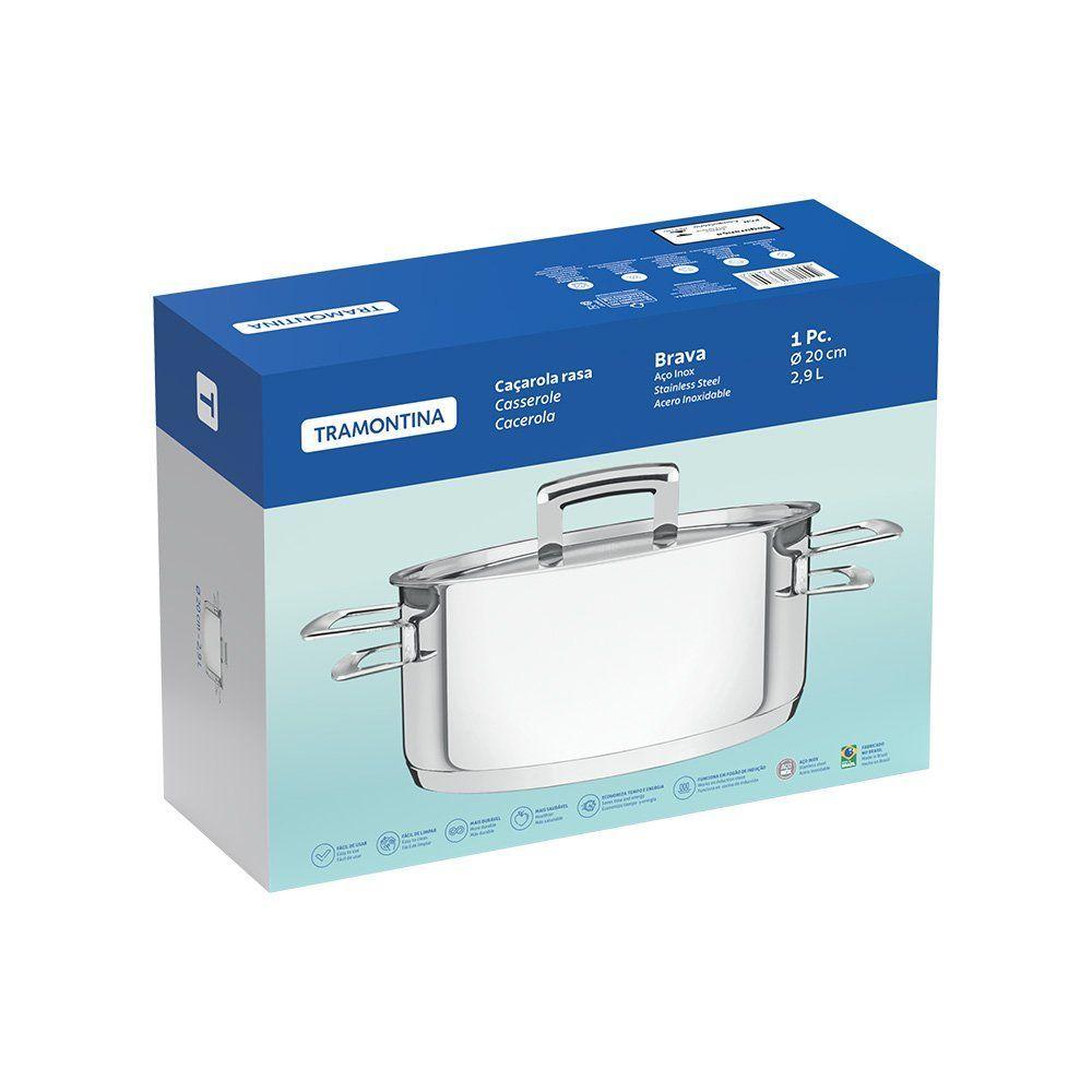 Caçarola Rasa Fundo Triplo Tramontina Brava 62403200 InoxCaçarola Rasa Fundo Triplo Tramontina Brava 62403200 Inox -Características Gerais do Produto:Dimensões AxLxP (mm): 133x295x221Material: Aço InoxTecnologia da Panela: Fundo TriploLinha: BravaTampa: Sim, com saída de vaporCapacidade da Panela: 2,9LObservação: com tampa planaPode ir ao forno?: Sim, para gratinar ou finalizar pratos na temperatura máxima de 260°C.Pode ir à Máquina de Lavar Louças?: SimTipo de Fogão: Gás, elétrico, vitrocerâmico e induçãoAcompanha o produto: - 1 Caçarola Ø 20cm Garantia: - 90 dias junto ao fabricante