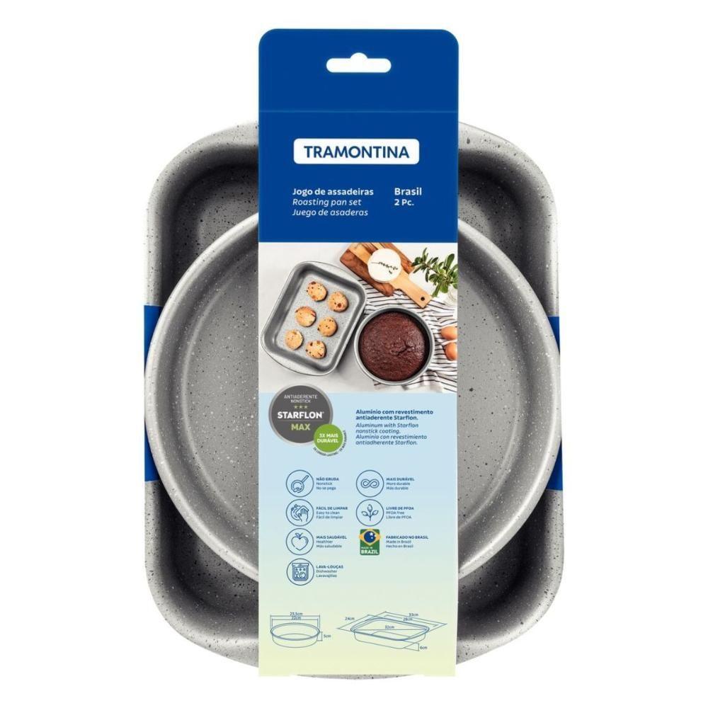 Jogo De Assadeiras Antiaderente Brasil 2 Peças Tramontina PretoJogo De Assadeiras Antiaderente Brasil 2 Peças TramontinaTorta salgada, bolo de chocolate ou aquela carne deliciosa no forno, ficam muito mais práticos de serem preparados com o jogo de assadeiras Tramontina Brasil em alumínio com revestimento interno e externo em antiaderente Starflon Max rosa 02 peças. Ideal para lhe acompanhar nas suas aventuras na cozinha, o jogo tem peças produzidas em alumínio com espessura que proporciona o cozimento rápido e uniforme dos alimentos. Seu revestimento, é completo em antiaderente Starflon Max, material que não gruda, é fácil de limpar, mais durável e não é prejudicial à saúde, pois é livre de PFOA. Além de todas essas características, as assadeiras podem ir à máquina de lavar louças e vão deixar seu dia a dia na cozinha muito mais fácil!Descrição do produtoMarca: TramontinaMaterial: AlumínioRevestimento Interno: AntiaderenteMáquina de Lavar Louça: SimLinha Comercial: AssadeirasConteúdo:01 Assadeira Funda 28 cm 3,3 L Brasil 33.3cm x 24.1cm x 6.2cm01 Assadeira Redonda Ø 22 cm 1,7 L Brasil 23.6cm x 23.6cm x 5cmImagens meramente ilustrativas, todos os itens que ambientam o produto não estão inclusos.Marca: Tramontina | Modelo: Brasil | Fonte do produto: Nacional | Linha: Brasil | Inclui tampa: Não | Material: Alumínio | É antiaderente: Sim | É descartável: Não | Condição do item: Novo | Unidades por kit: 2 | É apto para lava-louças: Sim Cor: Preto