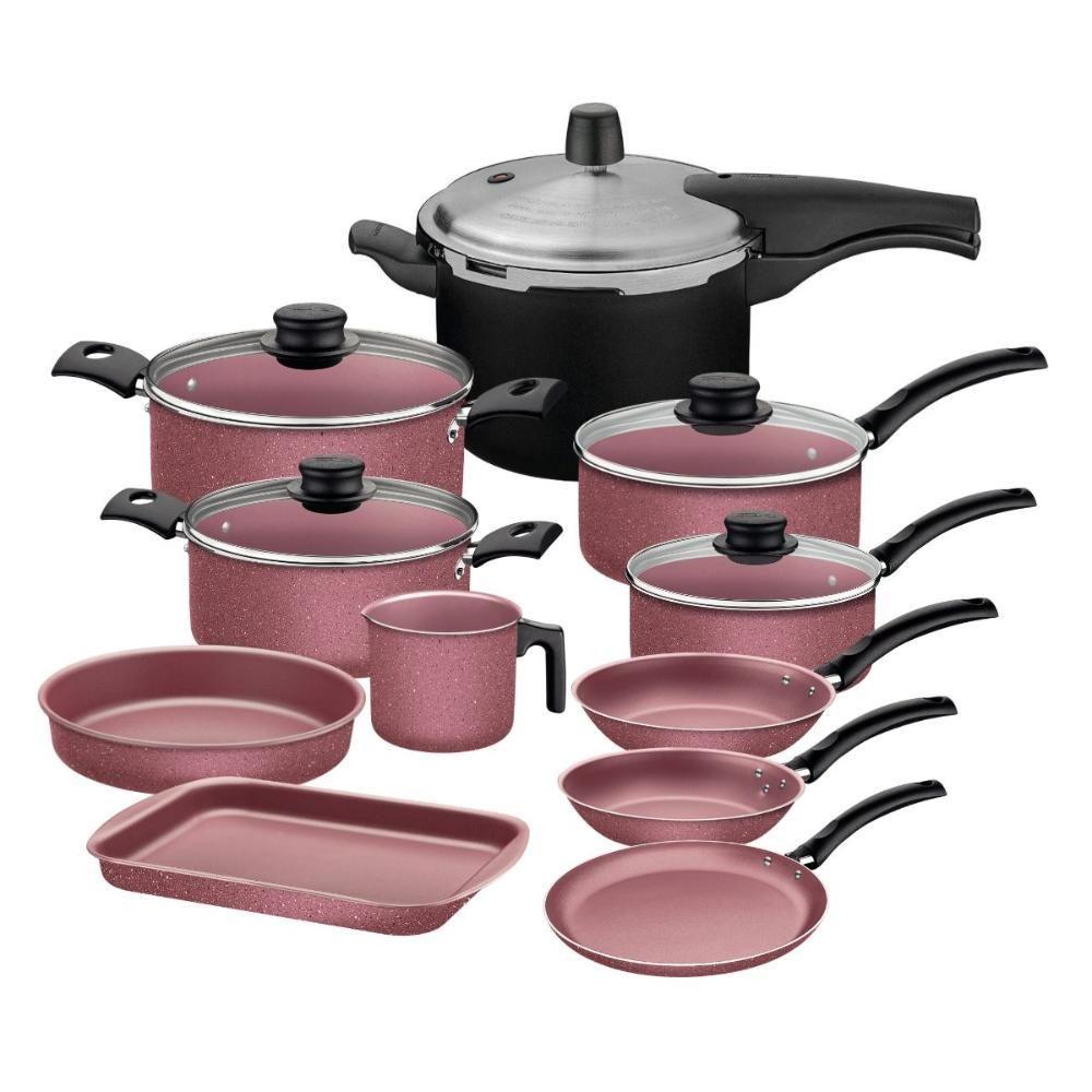 Jogo De Panelas 11 Peças Com Panela Pressão TramontinaJogo de Panelas 11 Peças com Panela Pressão TramontinaSeja qual for a receita que você vai preparar, é essencial contar com itens de qualidade, como o jogo de panelas Tramontina Turim e a Panela de Pressão Vancouver em alumínio com revestimento interno e externo em antiaderente Starflon Max. Aptas para uso no dia a dia, suas peças garantem maior segurança e facilidade na hora preparar suas refeições, pois contam com cabos, alças e pegadores em baquelite e nylon e vem com tampas de vidro temperado com borda de aço inox. Você ainda cozinha de maneira rápida e uniforme, sem que os alimentos grudem em sua superfície e tem facilidade na limpeza, pois o corpo das peças tem produção em alumínio com revestimento em antiaderente Starflon Max. Escolha Tramontina e deixe suas tarefas na cozinha, ainda melhores!Descrição:Linha Comercial: Turim e Vancouver.Quantidade: 11 Peças.Revestimento Interno: Antiaderente Starflon Max.Material: Alumínio com espessura de 1,2 mm que proporciona cozimento rápido e uniforme.Podem ir à máquina de lavar louças.Tipo de Fogão: Gás, Elétrico, Vitrocerâmico - resistência elétrica.ATENÇÃO: Não compatível com fogão de indução.Conteúdo:1 - Frigideira 16 cm 0,4 L Turim Rosa1 - Frigideira 20 cm 0,8 L Turim Rosa1 - Panquequeira/ Tapioqueira 22 cm 0,6 L Turim Rosa1 - Caçarola 18 cm 2 L Turim Rosa1 - Caçarola 20 cm 2,8 L Turim Rosa1 - Panela 14 cm 0,8 L Turim Rosa1 - Panela 16 cm 1,4 L Turim Rosa1 - Fervedor 12 cm 1,1 L Turim Rosa1 - Assadeira Rasa 28 cm 2 L Brasil Rosa1 - Assadeira Redonda 22 cm 1,7 L Brasil Rosa1 - Panela de Pressão com tampa escovada 20cm 4,5L Vancouver PretaImagens meramente ilustrativas, todos os itens que ambientam o produto não estão inclusos. Marca: Tramontina | Fabricante: Tramontina | Origem: Nacional | Modelo: Jogo de panelas | Condição do Item: Novo | É Kit: Sim | É apto para lava-louças: Sim | Material do cabo: Baquelite e nylon | Linha: Turim e Vancouver | Regulamentação Produto Perigoso: Não aplicável | Quantidade de peças: 11 | Com revestimento antiaderente: Sim | Revestimento interno: Antiaderente Starflon Max | Adequado para fogão de indução: Não | Materiais: Alumínio | É kit de fábrica: Não