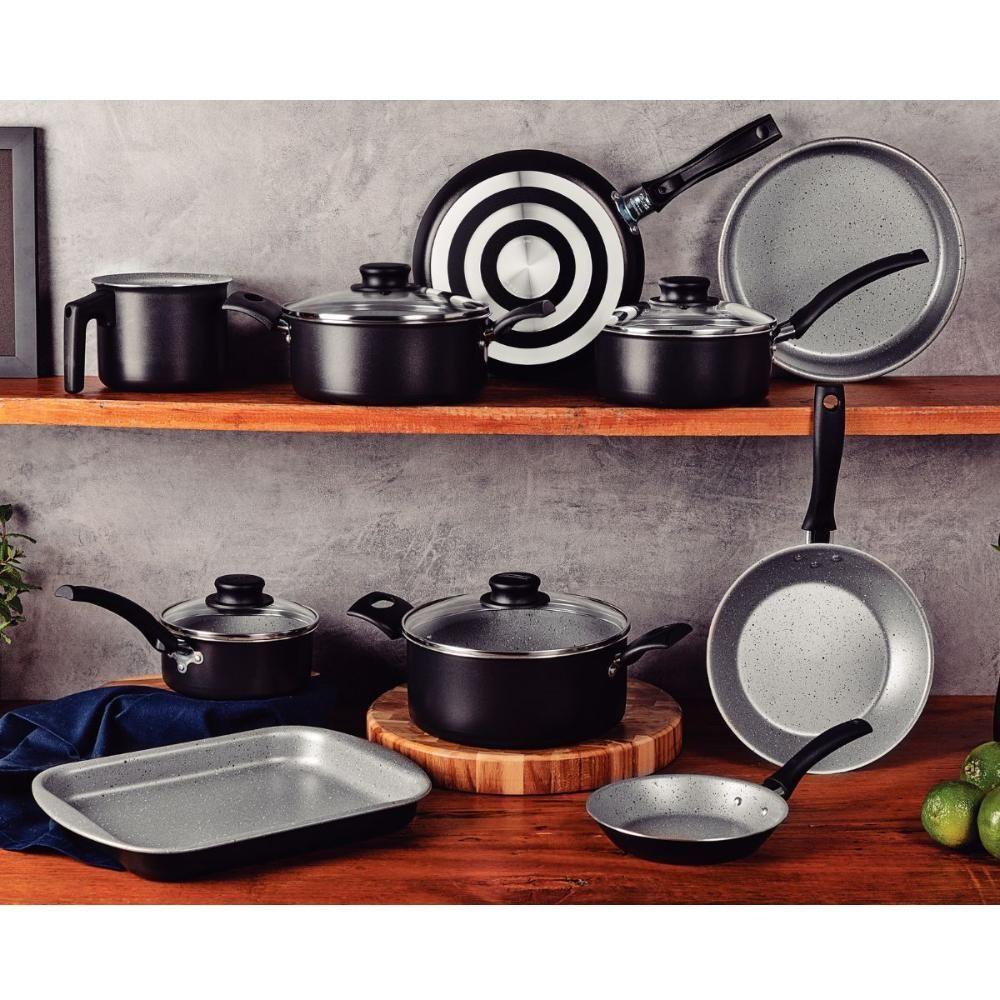 Jogo De Panelas 11 Peças Com Panela Pressão TramontinaJogo de Panelas 11 Peças com Panela Pressão TramontinaSeja qual for a receita que você vai preparar, é essencial contar com itens de qualidade, como o jogo de panelas Tramontina Turim e a Panela de Pressão Vancouver em alumínio com revestimento interno e externo em antiaderente Starflon Max. Aptas para uso no dia a dia, suas peças garantem maior segurança e facilidade na hora preparar suas refeições, pois contam com cabos, alças e pegadores em baquelite e nylon e vem com tampas de vidro temperado com borda de aço inox. Você ainda cozinha de maneira rápida e uniforme, sem que os alimentos grudem em sua superfície e tem facilidade na limpeza, pois o corpo das peças tem produção em alumínio com revestimento em antiaderente Starflon Max. Escolha Tramontina e deixe suas tarefas na cozinha, ainda melhores!Descrição:Linha Comercial: Turim e Vancouver.Quantidade: 11 Peças.Revestimento Interno: Antiaderente Starflon Max.Material: Alumínio com espessura de 1,2 mm que proporciona cozimento rápido e uniforme.Podem ir à máquina de lavar louças.Tipo de Fogão: Gás, Elétrico, Vitrocerâmico - resistência elétrica.ATENÇÃO: Não compatível com fogão de indução.Conteúdo:1 - Frigideira 16 cm 0,4 L Turim Preta1 - Frigideira 20 cm 0,8 L Turim Preta1 - Panquequeira/ Tapioqueira 22 cm 0,6 L Turim Preta1 - Caçarola 18 cm 2 L Turim Preta1 - Caçarola 20 cm 2,8 L Turim Preta1 - Panela 14 cm 0,8 L Turim Preta1 - Panela 16 cm 1,4 L Turim Preta1 - Fervedor 12 cm 1,1 L Turim Preto1 - Assadeira Rasa 28 cm 2 L Brasil Preta1 - Assadeira Redonda 22 cm 1,7 L Brasil Preta1 - Panela de Pressão com tampa escovada 20cm 4,5L Vancouver PretaImagens meramente ilustrativas, todos os itens que ambientam o produto não estão inclusos. Cor: Preto | Marca: Tramontina | Fabricante: Tramontina | Origem: Nacional | Modelo: Jogo de panelas | Condição do Item: Novo | É Kit: Sim | É apto para lava-louças: Sim | Material do cabo: Baquelite e nylon | Linha: Turim e Vancouver | Regulamentação Produto Perigoso: Não aplicável | Quantidade de peças: 11 | Com revestimento antiaderente: Sim | Revestimento interno: Antiaderente Starflon Max | Adequado para fogão de indução: Não | Materiais: Alumínio | É kit de fábrica: Não