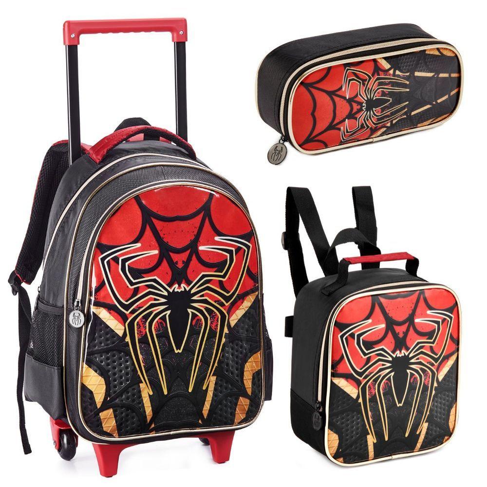 Kit Mochila Rodinhas Lancheira Estojo Duplo Homem Aranha Spider Dark Aranha Miles