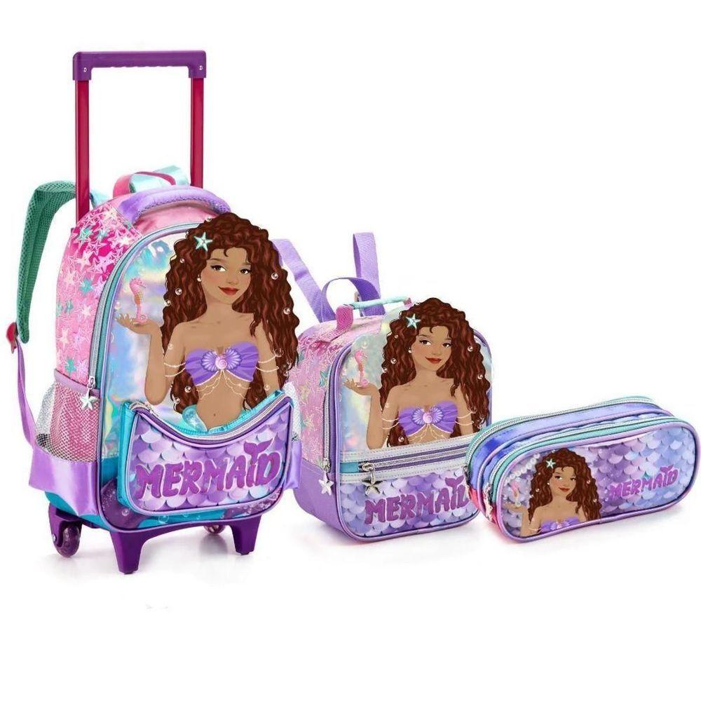 Kit Mochila Rodinha Lancheira Estojo Escolar Sereia Morena