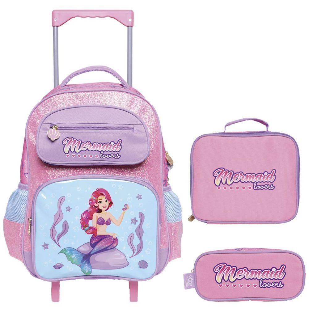 Kit Mochila Rodinha Lancheira Estojo Infantil Escolar Menina Ariel Pequena Sereia Mermaid Yins