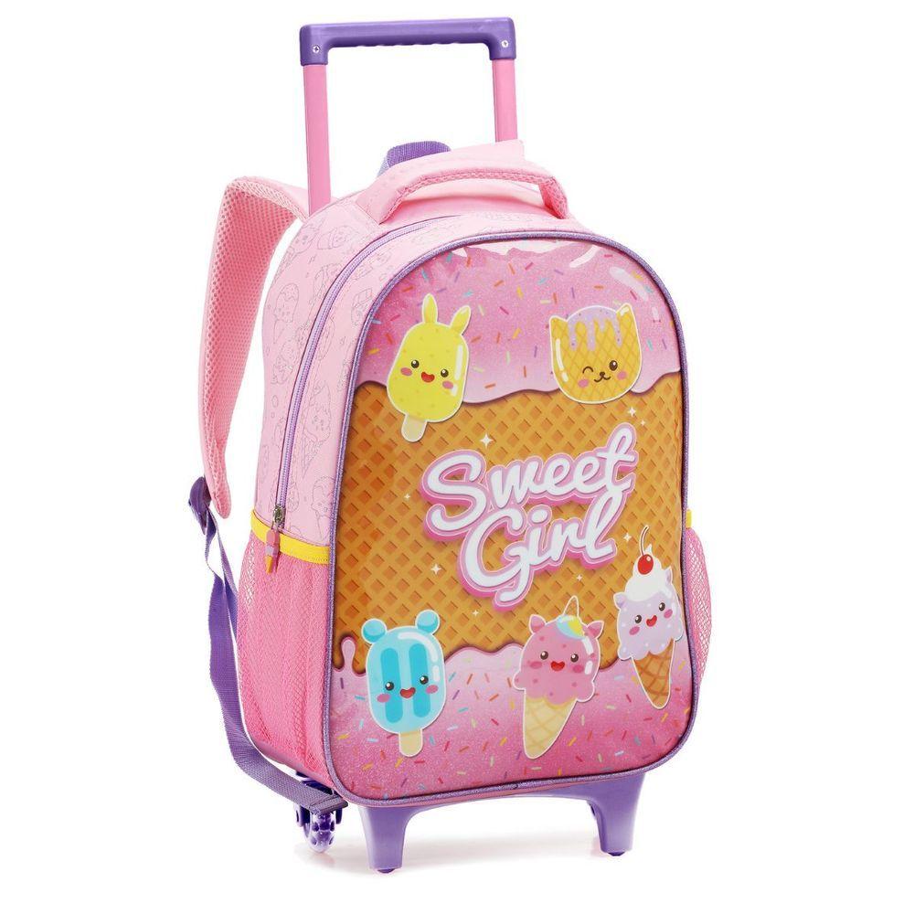 Kit Mochila Rodinha Lancheira Estojo Duplo Menina Escolar Infantil Sweet Girl Sorvete Rosa Seanite