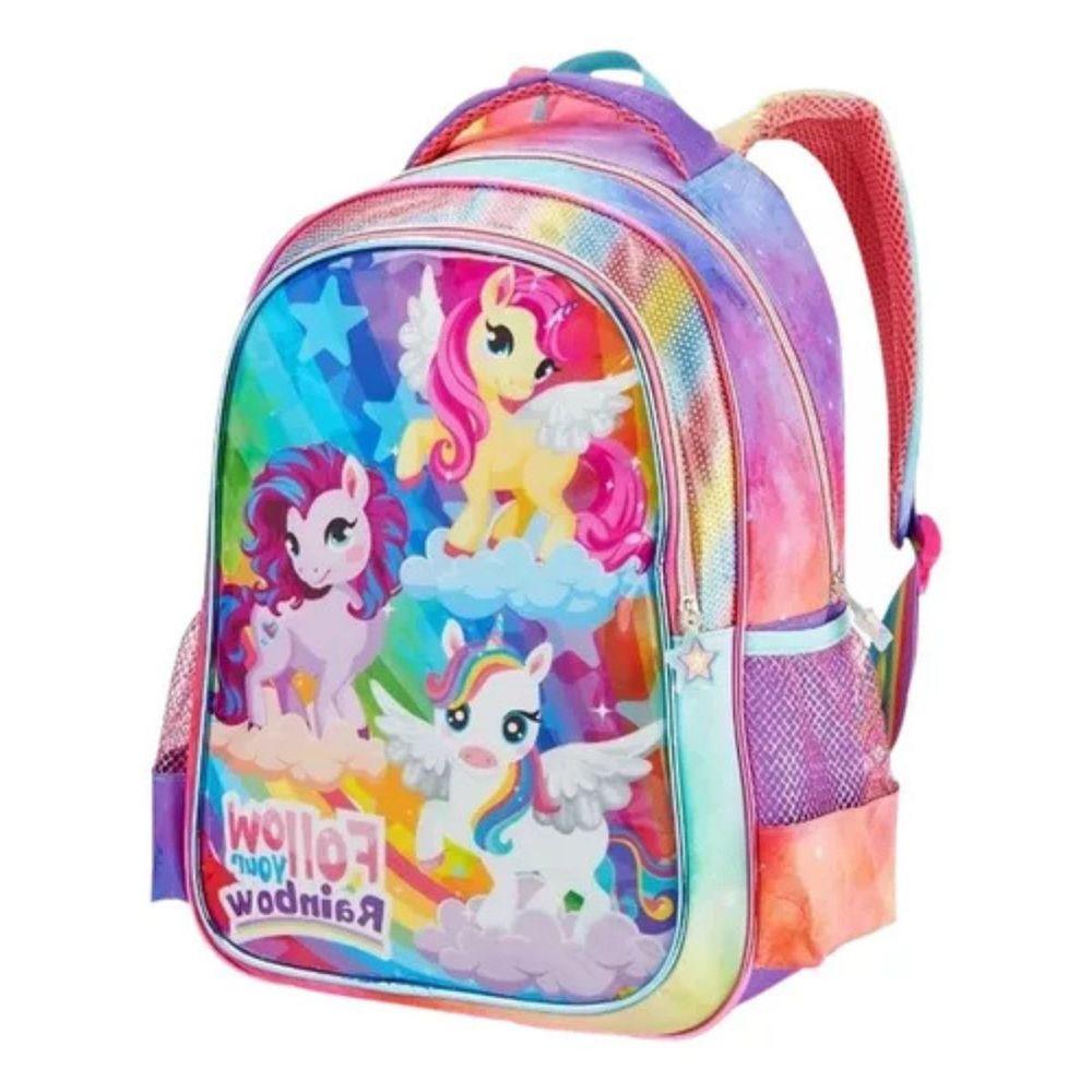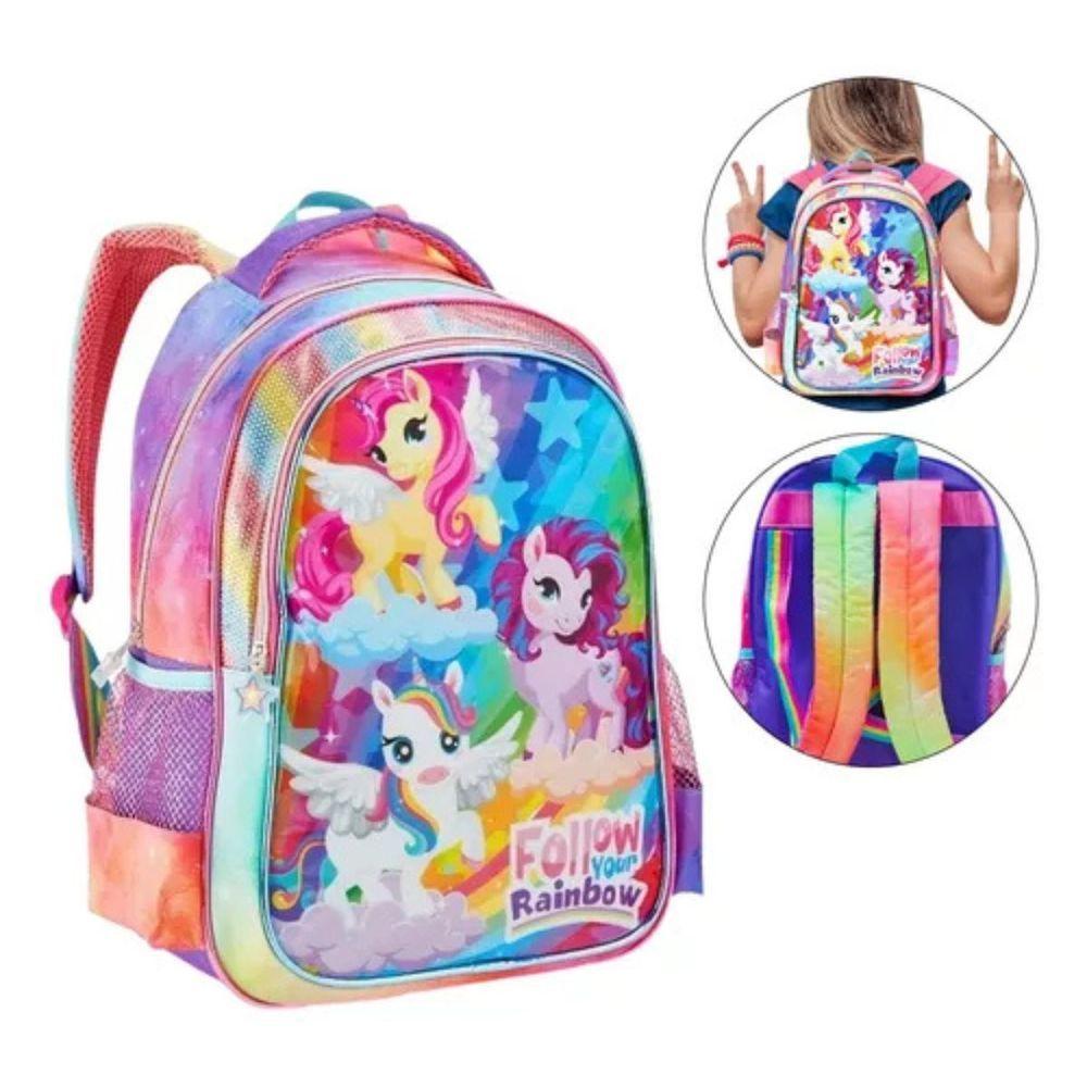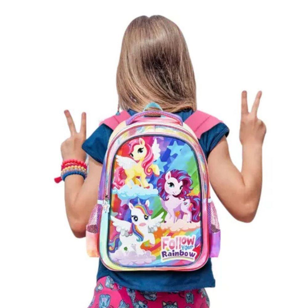 Mochila Costas Unicórnio Escolar Infantil Menina Follow Rainbow Denlex
