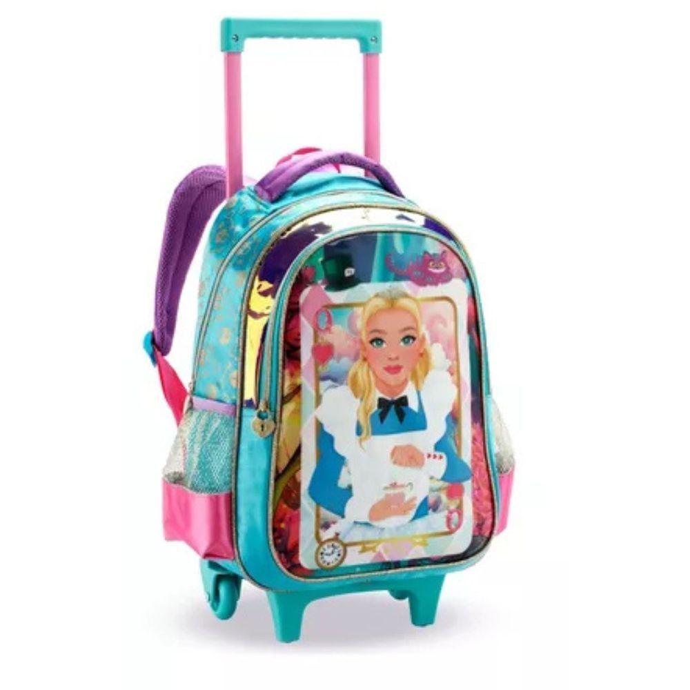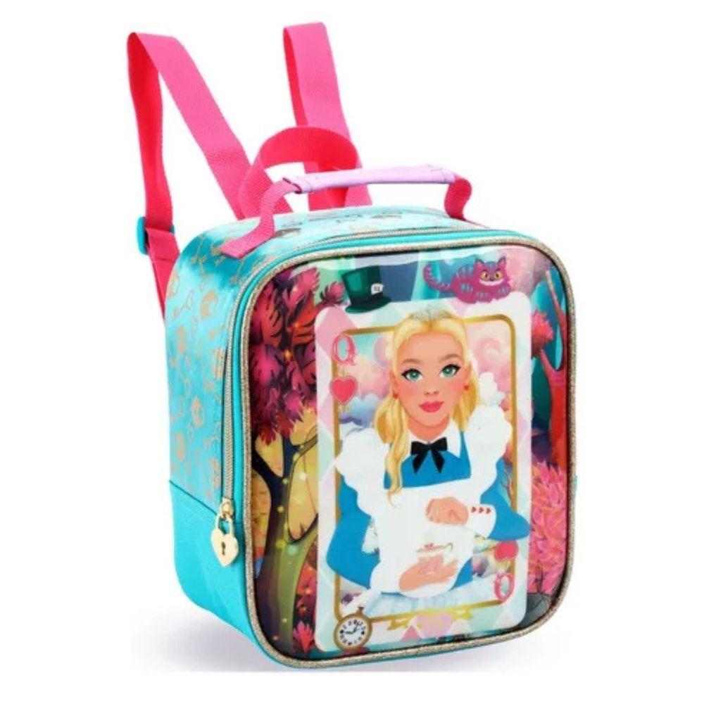 Kit Mochila Rodinha Lancheira Estojo Alice Baralho Infantil Escolar Azul Denlex