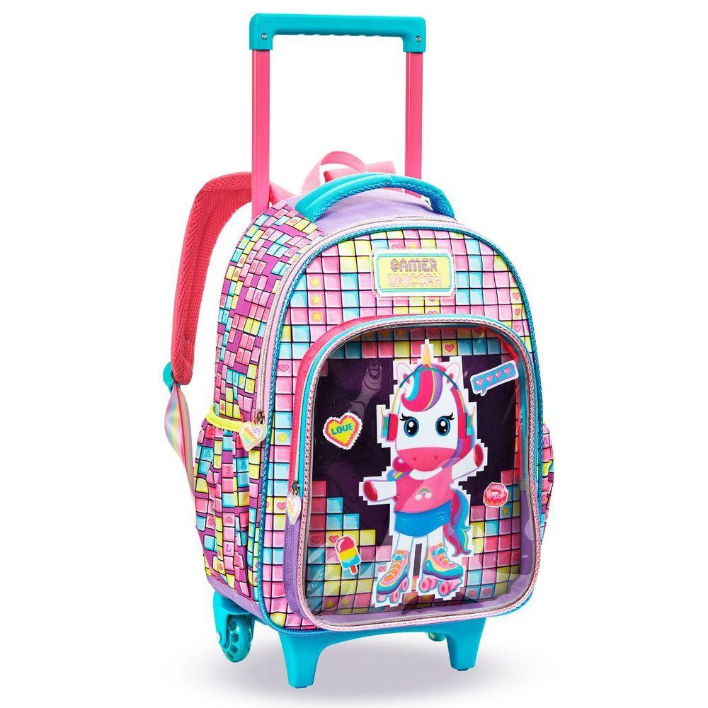Kit Mochila Rodinhas Lancheira Estojo Escolar Unicornio Gamer