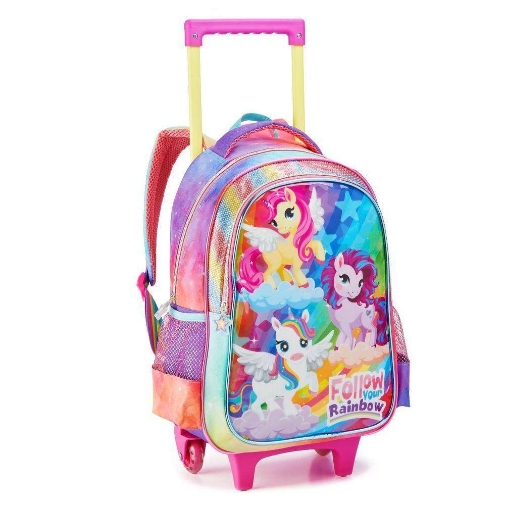 Kit Mochila Rodinhas Lancheira Estojo Escolar UnicornioKit Mochila Escolar Infantil Menina RodinhasPossui ótimo espaço interno para transportar livros e cadernos, mochila resistente para uso de dia diaCaracterísticas do produto:Mochila de rodinha- Composição: 70% Poliéster 30% PVC- Rodinhas de silicone de alta resistência- 2 bolsos laterais para garrafa e objetos pequeno- Alças reforçada- Alças de ombro acolchoadas- Alça de mão acolchoada- Puxadores de zíper personalizada- Identificador no verso- Tamanho com rodinhas aproximado: 46cm x 30cm x 15cm- Altura total com haste puxado: 75cmLancheira:- Composição: 70% Poliéster 30% PVC- Sistema térmico- Alça costas- Identificador no verso- Elástico interno para fixação da garrafa- Elástico costas para fixação ao carrinho- Certificação Inmetro- Tamanho aproximado: 23cm x 20cm x 13cmEstojo:- Composição: 60% Poliéster 40% PVC- Certificação Inmetro- Tamanho aproximado: 21cm x 10cm x 6cmItem incluso:- 01 mochila rodinha- 01 lancheira termica- 01 estojo duplo