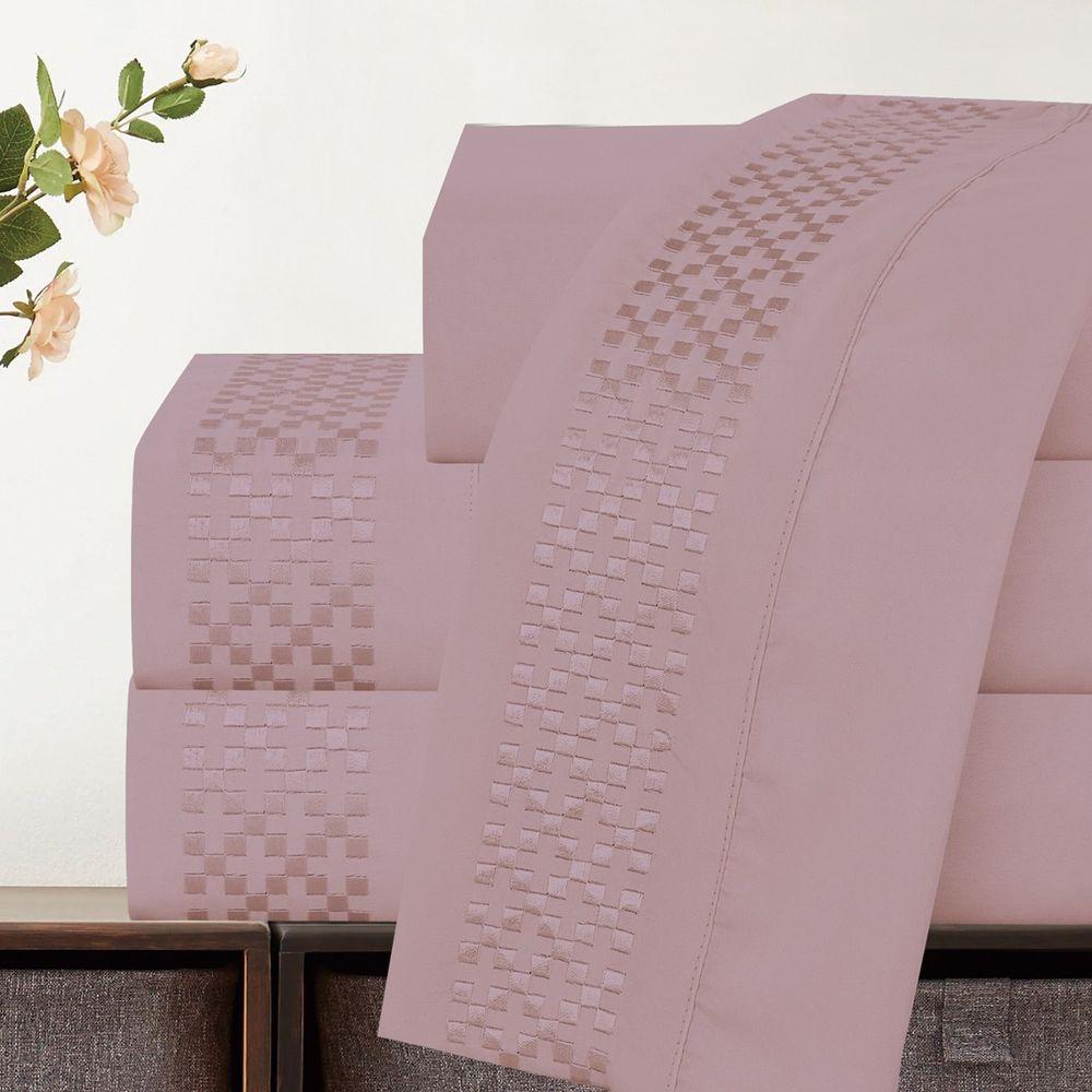 Jogo De Lençol Casal Quadratto Bordado 300 Fios Micropercal Toque De Algodão 4 Peças - Rose - 100% Poliéster