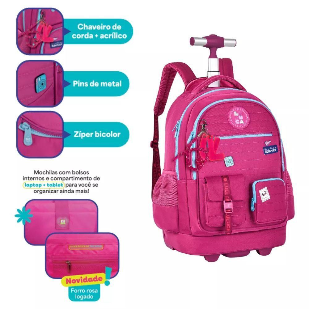 Mochila De Carrinho Oficial Luluca Clio Style Rosa- 24634Mochila de Carrinho Oficial Luluca Clio Style Rosa - 24634Mochila de Rodinha 2 em 1 Alça de Costas Oficial Luluca Clio Style - LU24634Luluca continua com a Clio Style e traz uma coleção super estilosa e ligada às tendências de moda.CARACTERÍSTICAConfeccionada em nylon, Material de alta qualidade, resistência e durabilidade;Zíper bicolor: um toque de estilo e autenticidade;Compartimento principal com amplo espaço interno com divisória para notebook;Compartimentos frontais, 02 bolsos laterais telados;Alças reguláveis e Acolchoada, podem ser ajustadas;Proteção de rodas e base de apoio para manter a mochila em pé;Haste retrátil em metal com 2 níveis de regulagem;MEDIDASAltura: 50 CMLargura: 32 CMProfundidade: 20 CM
