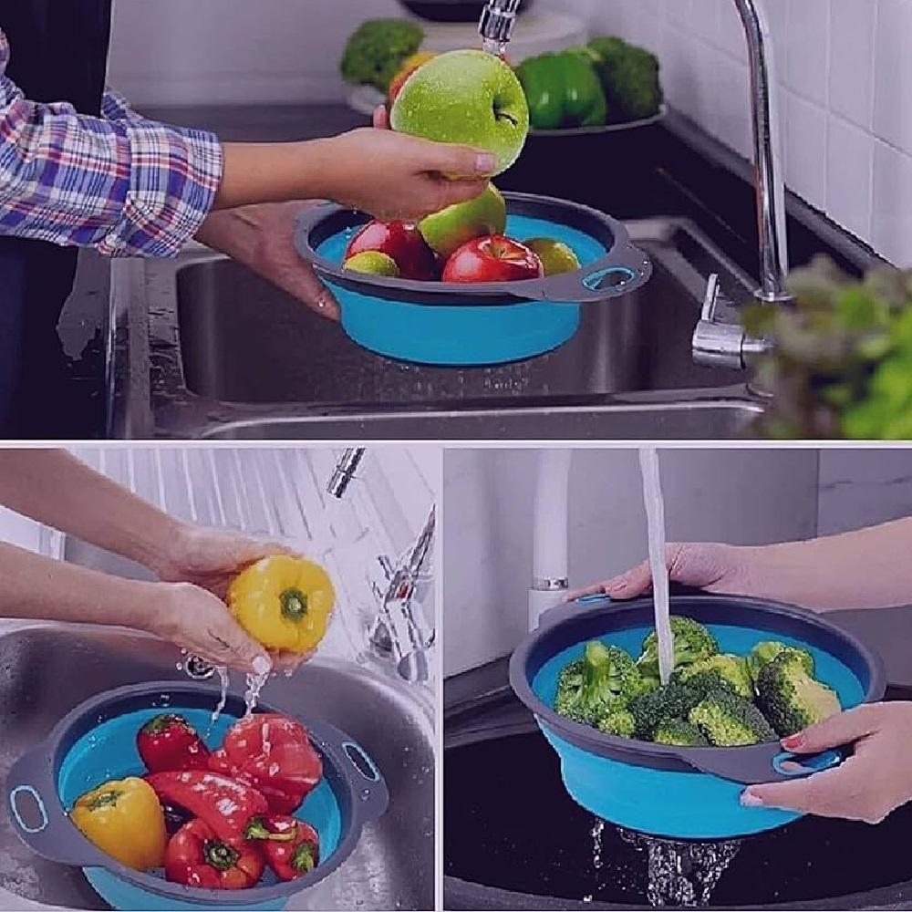 Escorredor De Alimentos Em Silicone Retratil Portatil Macarrao Lavar Legumes Salada Frutas Cozinha Azul