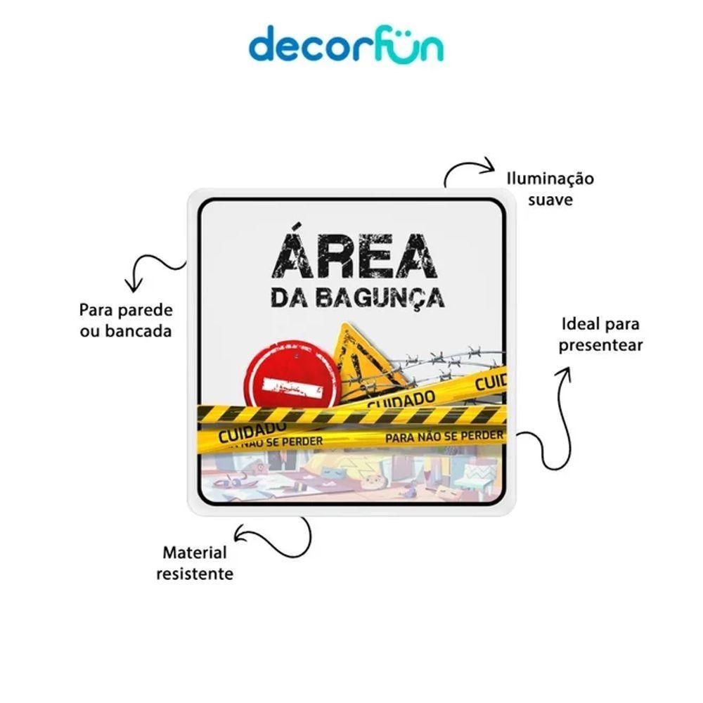 Luminária Quadrada área Da Bagunça Enfeite De Porta Criativo BivoltAdicione humor e estilo à sua decoração com o Slim Box “Área da Bagunça”, o quadrinho iluminado perfeito para deixar qualquer espaço mais divertido e acolhedor. Ideal para paredes ou bancadas, ele combina iluminação suave com design criativo, sendo um presente divertido e funcional.Produzido em polipropileno resistente, acompanha fita de LED 5W já inclusa. A alimentação é feita via cabo USB de 1,20m com plugue liga/desliga, oferecendo praticidade e versatilidade.• Decoração divertida e funcional: ilumina e dá personalidade ao ambiente.• Versátil: pode ser colocado na parede ou apoiado em bancadas.• Prático: cabo USB com interruptor integrado para ligar/desligar facilmente.• Presente criativo: ideal para amigos, familiares ou colecionadores de itens divertidos.• Material resistente: polipropileno durável e leve.Especificações do produto:Uso: parede ou bancadaDimensões: 20 x 18 x 5 cm (A x L x P)Material: PolipropilenoIluminação: Fita de LED 5W inclusaAlimentação: Cabo USB 1,20m com plugue liga/desligaObservação: não acompanha fonte ou tomada USBTensão: Bivolt
