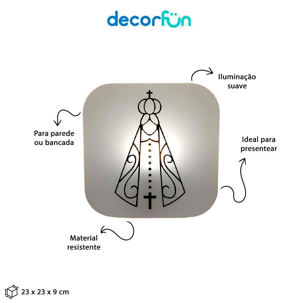 Luminária Sagrada Nossa Senhora - Ilumine Sua Casa Com Beleza E FéA Luminária Box Nossa Senhora era o que faltava na decoração da sua casa!Podendo ser usada na mesa ou na parede. ;Para não faltar beleza, amor, fé e espiritualidade.Especificações do produto:Uso: parede ou sobre bancadas.Tamanho (cm): 23 x 23 x 9 ( Altura x Largura x Profundidade)Lâmpadas: Compactas fluorescentes até 10W ou LED compatível com abertura inferior da luminária (lâmpadas não inclusas) (E-27)Material: PolietilenoTensão: 110V/220VAlimentação: Cabo de força com interruptor medindo 1,8m de comprimentoCuidados: Limpar com pano úmido e macio. Teme químicos e abrasivos. Não utilizar lâmpadas incandescentes de qualquer tipo