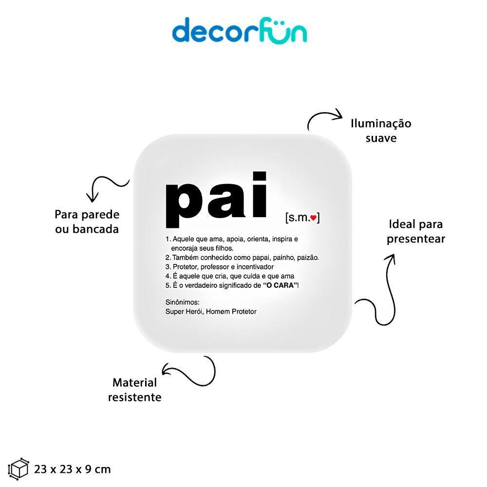 Luminária Mágica Com Mensagem Especial Para Pais - Ilumine Seu Amor!Surpreenda seu pai com a ;Luminária Box Significado Pai!Decore qualquer ambiente com ;a Luminária Box Significado Pai, ela vai encantar o seu quarto, aquele seu cantinho especial e até mesmo o seu escritório. Além de ser um item incrível, ela pode agregar no espaço de leitura por ser uma luz difusa, o que não agride a visão, além de deixar o local com uma iluminação mais baixa. Sendo Bivolt com a ;Luminária Box Significado Pai, você não precisa se preocupar com nada, basta ligar na tomada e ligar.<address> ;</address>Especificações do produto:Material: Polietileno ;e componentes eletrônicosDimensões: 23 x 23 x 9 ;cmAlimentação: Cabo de força com interruptor medindo 1,8m de comprimentoCuidados: Limpar com pano úmido e macioInformações adicionais: Compactas fluorescentes até 10W ou LED compatível com abertura inferior da luminária (lâmpadas não inclusas) (E-27)Cuidados: Limpar com pano úmido e macio. Teme químicos e abrasivos. Não utilizar lâmpadas incandescentes de qualquer tipo.Perguntas frequentesA luminária pode ser pendurada na parede ?Sim ela pode ser pendurada na parede, já consta com furos para ser instalada (parafusos não inclusos).