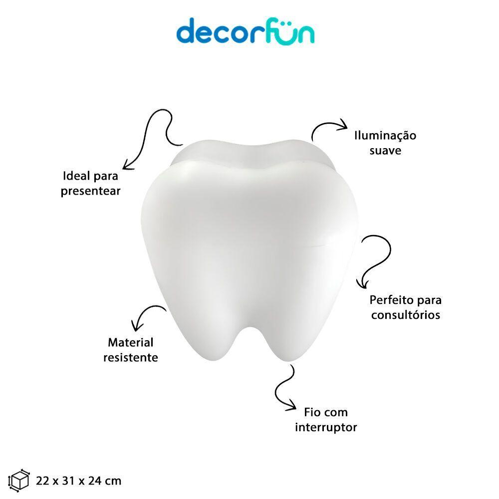 Iluminação Encantadora: Luminária Em Forma De Dente Para Decoração Do Seu EspaçoPerfeita para sua decoração, a Luminária Dente Brilhante , vai encantar seu quarto, seu cantinho especial e seu escritório,além de enfeitar pode agregar no espaço de leitura por ser uma luz difusa, o que não agride a visão, além de deixar o local com uma iluminação mais baixa. Sendo Bivolt com a Luminária Dente Brilhante , você não precisa se preocupar com nada, basta ligar na tomada e ligar.Especificações do produto:Material: Plástico polietileno, componentes eletrônicosDimensões: 22 ;X 31 ;X 24 ;cm ; ;Dimensões do cabo: 1,8mTensão: Bivolt (110/220V)Informações de conservação: Limpar com pano úmidoInformações adicionais:Utiliza lâmpada LED até 10W ou fluorescente compacta (lâmpada NÃO inclusa). Para troca de lâmpada você precisará de uma chave philips pequena.Contra indicações: Não utilizar lâmpadas incandescentes de qualquer tipo.<address> ;</address>