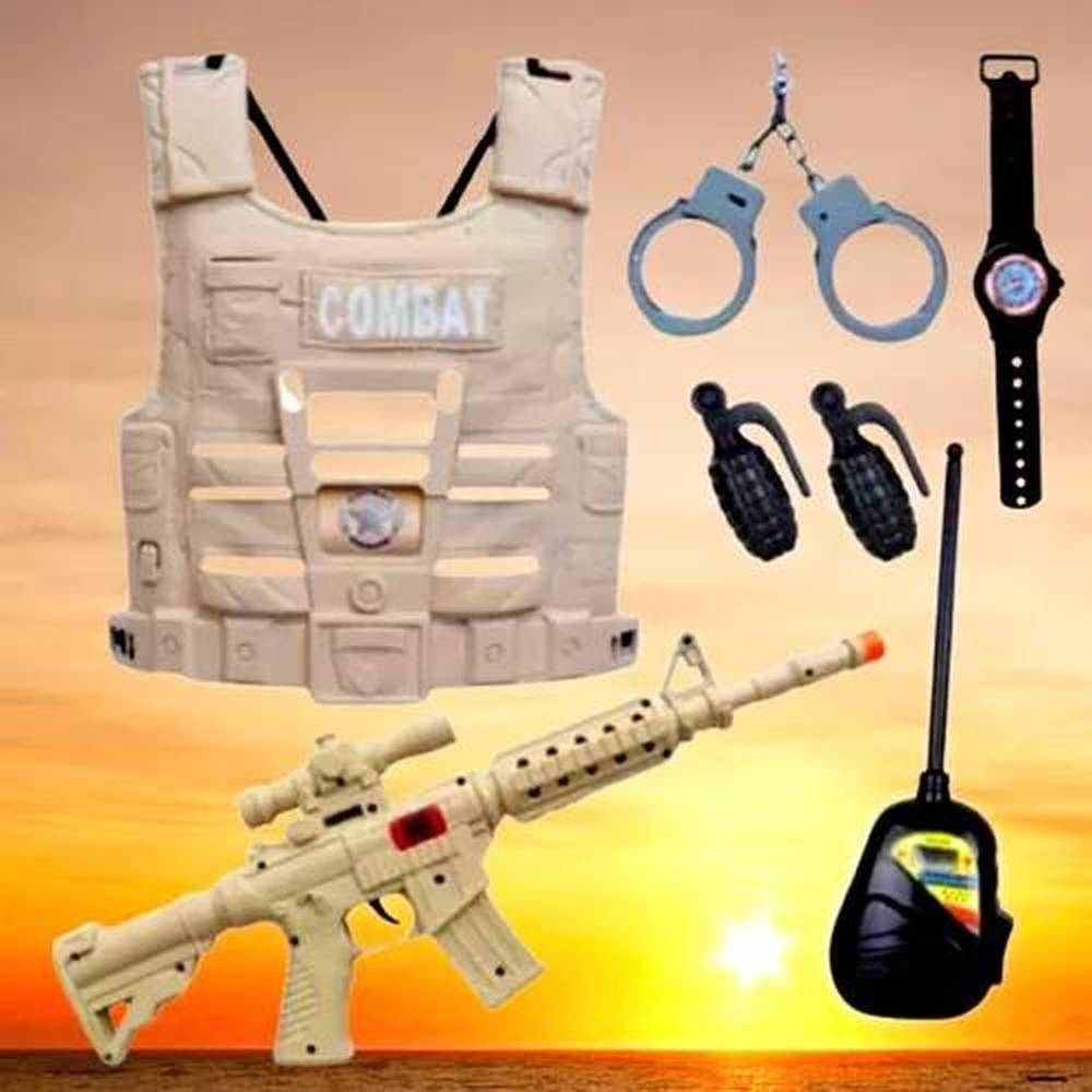 Kit De Combate Com Rifle E Acessórios Brinquedo InfantilKit de Combate com Rifle e Acessórios Brinquedo Infantil============================================================Ideal para crianças que adoram aventuras e brincadeiras de faz de conta, este conjunto completo traz todos os acessórios para estimular a imaginação, o trabalho em equipe e a criatividade.O kit proporciona diversão segura e educativa, onde os pequenos podem se imaginar como verdadeiros heróis em ação, prontos para proteger e defender!Feito com material durável e com ajuste fácil, a máscara traz mais realismo à brincadeira, proporcionando proteção e diversão.Inclui alguns utensílios de policias bem realista, que adicionam um toque especial à brincadeira, permitindo que a criança se envolva ainda mais em suas simulações.============================================================Contém:01 Rifle de Brinquedo01 Colete02 Granadas01 Rádio01 Relógio01 AlgemaEspecificações:- Material: Plástico e Tecido- Medida Colete: 31cm x 26cm- Medida Rifle: 47cm x 04cm x 17cm- Medida Granada: 08cm de altura (cada)- Medida Rádio: 17cm x 05cm- Modelo: Kit Militar Combate- Cor: Bege- REGISTRO INMETRO: 009179/2024ATENÇÃONão indicado para crianças menores de 03 anos por conter peças pequenas que podem ser engolidas ou aspiradas.A embalagem contém fechos metálicos, retirar antes de entregar o brinquedo para a criança============================================================Devido à diferença entre monitores e iluminação diferentes, pode haver variação na tonalidade apresentada no anúncio. Medidas muito aproximadas.Kit de Combate com Rifle e Acessórios Brinquedo Infantil============================================================Ideal para crianças que adoram aventuras e brincadeiras de faz de conta, este conjunto completo traz todos os acessórios para estimular a imaginação, o trabalho em equipe e a criatividade.O kit proporciona diversão segura e educativa, onde os pequenos podem se imaginar como verdadeiros heróis em ação, prontos para proteger e defender!Feito com material durável e com ajuste fácil, a máscara traz mais realismo à brincadeira, proporcionando proteção e diversão.Inclui alguns utensílios de policias bem realista, que adicionam um toque especial à brincadeira, permitindo que a criança se envolva ainda mais em suas simulações.============================================================Contém:01 Rifle de Brinquedo01 Colete02 Granadas01 Rádio01 Relógio01 AlgemaEspecificações:- Material: Plástico e Tecido- Medida Colete: 31cm x 26cm- Medida Rifle: 47cm x 04cm x 17cm- Medida Granada: 08cm de altura (cada)- Medida Rádio: 17cm x 05cm- Modelo: Kit Militar Combate- Cor: Bege- REGISTRO INMETRO: 009179/2024ATENÇÃONão indicado para crianças menores de 03 anos por conter peças pequenas que podem ser engolidas ou aspiradas.A embalagem contém fechos metálicos, retirar antes de entregar o brinquedo para a criança============================================================Devido à diferença entre monitores e iluminação diferentes, pode haver variação na tonalidade apresentada no anúncio. Medidas muito aproximadas.