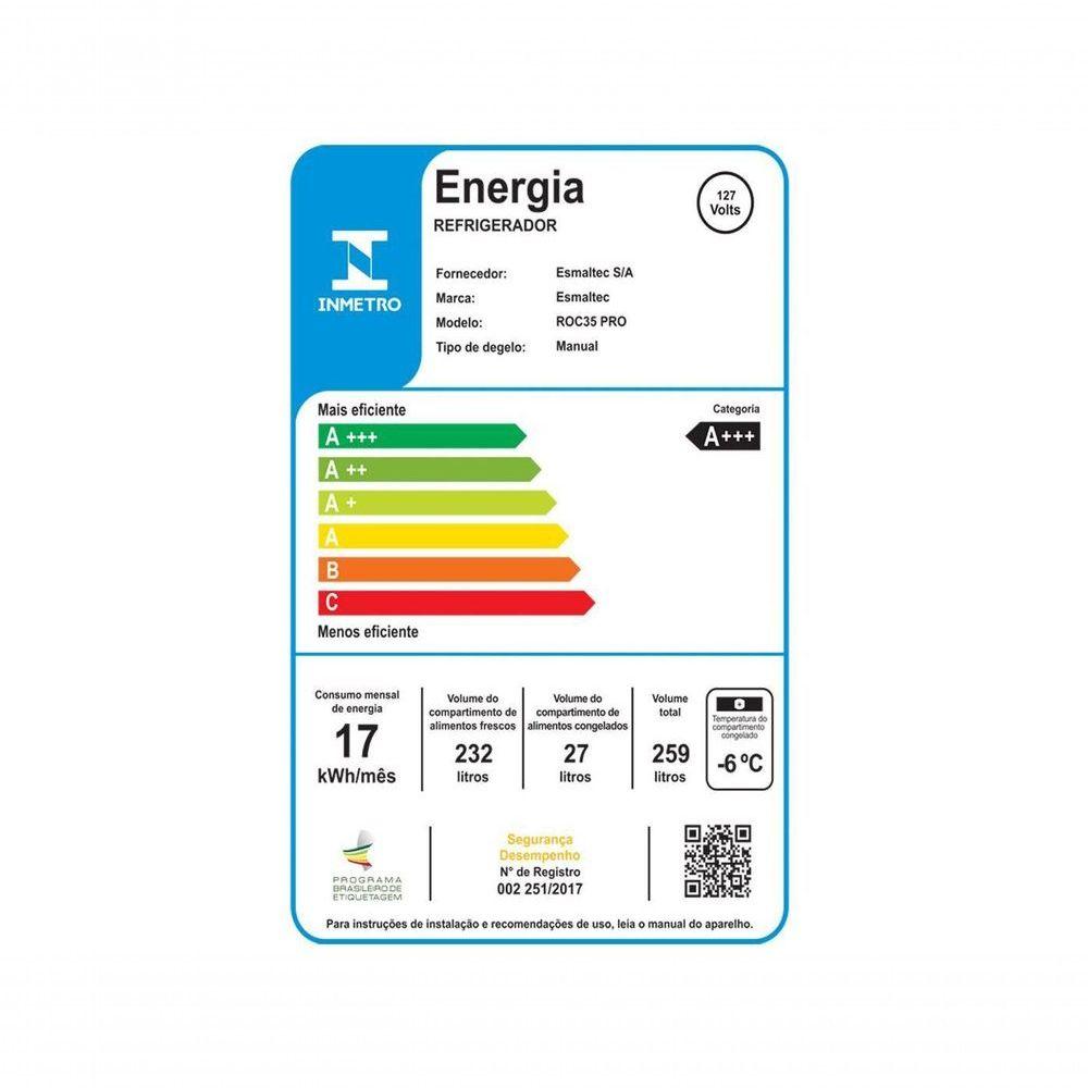 Geladeira Esmaltec Inverter Cycle Defrost ROC35 Pro Branco 259L 110VGeladeira Esmaltec 259L Inverter Cycle Defrost - BrancaO refrigerador Esmaltec ROC35 Pro na cor branca proporciona maior economia na conta de energia, pois reduz o tempo de resfriamento, mantém a temperatura mais estável e ajuda a reduzir o desperdício de alimentos. Com alta capacidade de 259 litros, compressor Inverter e classificação A+++, é a escolha ideal para quem busca eficiência e praticidade.Principais Características:Compressor Inverter com Eficiência A+++: Garante uma operação mais silenciosa, com maior durabilidade, temperatura estável e uma economia de energia superior, com a máxima classificação de eficiência.Grande Capacidade e Organização: Possui 259 litros de capacidade total bem distribuída, com prateleiras internas reguláveis e removíveis, gaveta de legumes e compartimentos na porta em PS Cristal.Gaveta de Resfriamento Rápido: Um compartimento especial ideal para resfriar bebidas e alimentos de forma muito mais rápida.Congelador de -6°C: O congelador interno de 27 litros é perfeito para conservar alimentos congelados e produzir gelo.Design Funcional: Conta com iluminação lateral para boa visibilidade, pés elevados e niveladores que facilitam a limpeza, e borrachas de vedação destacáveis que podem ser substituídas sem a necessidade de trocar a porta.Especificações Técnicas:Marca: EsmaltecModelo: ROC35 ProVoltagem: 110VEAN: 7899081700809Tipo: Geladeira 1 PortaCapacidade Total: 259 LitrosCapacidade do Congelador: 27 LitrosTipo de Degelo: Cycle DefrostEficiência Energética: A+++Compressor: InverterGás Refrigerante: R600a (Ecológico)Cor: BrancoPeso: 36,34 kgDimensões [AxLxP]: 157,8 x 55,7 x 66 cmGarantia: 12 meses