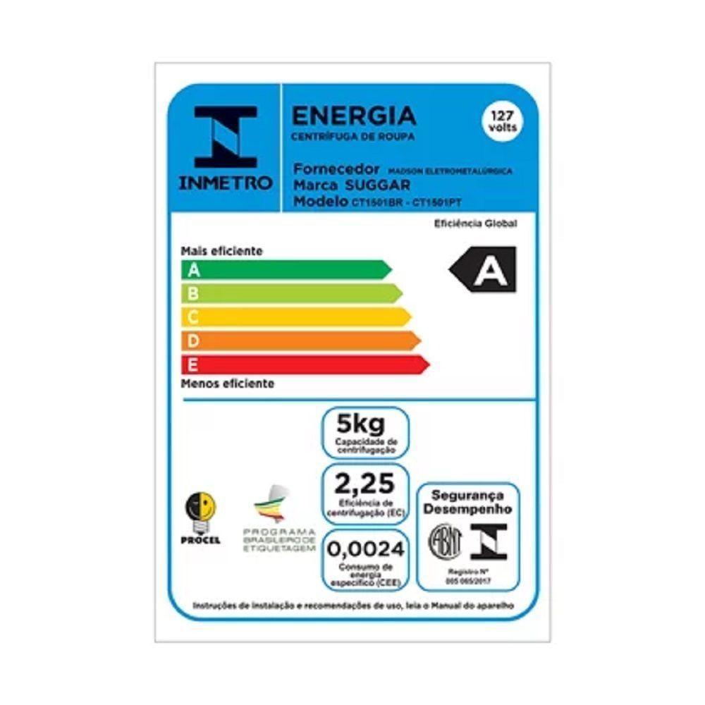 Centrífuga De Roupas Suggar Giromax 15Kg Preto 220VCentrífuga de Roupas Suggar Giromax 15kg PretaTorcer a roupa lavada não é uma tarefa fácil, a não ser que você tenha a Centrífuga Giromax da Suggar. Com uma alta eficiência de rotação, ela deixa suas roupas quase secas em apenas 6 minutos. Ideal para famílias grandes, centrifuga até 15kg de roupas molhadas, incluindo peças grandes como edredons King Size.Principais Características:Grande Capacidade (15kg): Centrifuga um grande volume de roupas de uma só vez, o que equivale a 5kg de roupas secas. Perfeita para peças volumosas como roupas de cama e banho.Alta Eficiência: Com uma centrifugação potente, deixa as roupas quase secas em um ciclo de apenas 6 minutos, acelerando muito o tempo de secagem no varal.Sistema de Segurança Exclusivo: Conta com uma trava que impede a abertura da tampa durante o funcionamento e uma grade de proteção interna, garantindo total segurança para você e sua família.Praticidade e Design Funcional: Possui timer de 6 minutos com desligamento automático, alças laterais para fácil transporte, uma base larga que garante mais estabilidade e saída de água frontal.Especificações Técnicas:Marca: SuggarModelo: Giromax CT1502PTVoltagem: 220VEAN: 7908312801946 (220V)Tipo: Centrífuga de RoupasCapacidade: 15 kg (roupa molhada)Potência: 180WTimer: 6 minutosCor: PretoPeso: 6,55 kgDimensões [AxLxP]: 69,5 x 42 x 41,6 cmGarantia: 12 meses