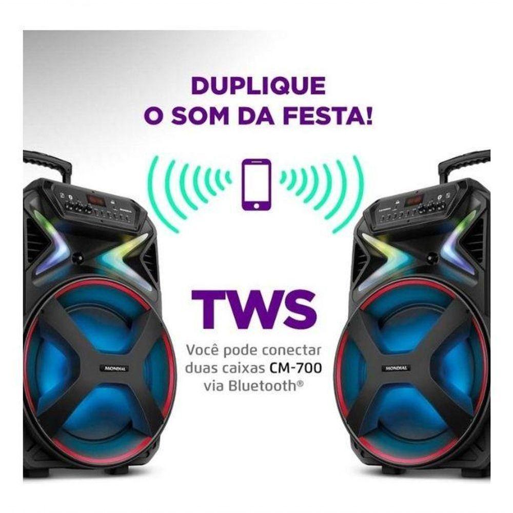 Caixa Amplificada Mondial Connect Lights Plus CM-700 Preto BivoltCaixa de Som Amplificada Mondial Connect Lights Plus CM-700A Caixa de Som Amplificada Multiuso Connect Lights Plus CM-700 é perfeita para levar a festa com você! Com 700W RMS de potência e alto-falante de 15 polegadas, oferece som potente e versátil. Conta com conexão Bluetooth, entrada USB, entrada auxiliar, entrada para microfone e guitarra, além de rádio FM e bateria interna recarregável, permitindo levar o som para qualquer lugar. Pode ser recarregada na tomada 127V ou 220V (bivolt) e também possui entrada 12V DC para conectar em baterias externas, como no carro.Com o Bluetooth, você toca músicas diretamente do celular sem fios. Já a tecnologia TWS (True Wireless Stereo) permite conectar duas caixas CM-700 via Bluetooth, duplicando a potência do som. O display digital facilita a visualização das funções, e as luzes Flash Light tornam o ambiente ainda mais animado.Destaques do ProdutoMúltiplas conexões: USB, auxiliar, microfone e guitarra.Bluetooth: conecte celular ou serviços de streaming sem cabos.Alto-falante de 15” para graves potentes.Função TWS: conecte duas CM-700 via Bluetooth, sem fios.Flash Light: luzes coloridas que piscam e animam o ambiente.Bateria interna recarregável e bivolt.Entrada 12V DC: conecte em baterias externas (ex.: carro).Rodinhas e alça retrátil para fácil transporte.Rádio FM estéreoDisplay digital para melhor visualização das funções.Compatibilidade: microfone, celular, notebook, TV, violão, guitarra, teclado e mais.Informações TécnicasModelo: CM-700Cor: Preto/VermelhoPotência: 700WBluetooth: SimFunção TWS: SimBateria interna recarregável: SimEntrada para bateria externa: SimEntrada e saída de áudio (L/R): SimEntrada USB: SimEntrada auxiliar: SimEntrada Micro SD Card: NãoEntrada para microfone: SimEntrada para instrumentos musicais: SimDisplay digital: SimRádio FM: SimEqualizador digital: SimFunção troca pasta: SimFunção gravar: SimVolume independente para microfone: SimVolume independente para guitarra: SimFunção eco: SimControle de grave e agudo: SimRodas para transporte: SimAlça para transporte: SimFlash Light: SimEntrada para tripé: SimControle remoto: NãoVoltagem: BivoltItens inclusos: 01 Caixa amplificada + Manual de instruçõesDimensões e PesoAltura: 70 cmLargura: 42 cmProfundidade: 39 cmPeso: 11,4 kgEAN: 7899882312799Garantia12 meses