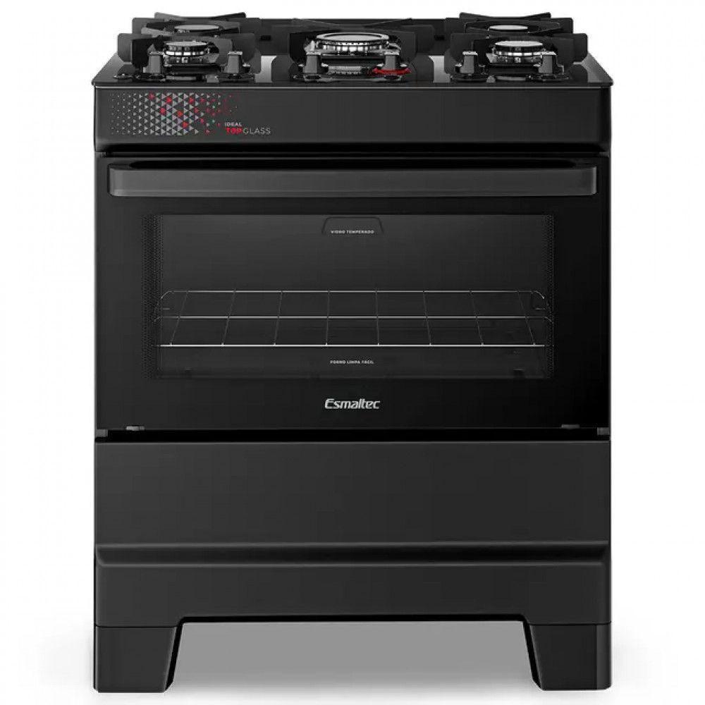 Fogão Esmaltec Ideal Top Glass 5 Bocas T5VAP 5126 Acendimento Automático Preto BivoltFogão Ideal Top 5 Bocas Automático Mesa de Vidro Bivolt EsmaltecFogão esmaltec ideal top 5 bocas automático mesa de vidro: O Fogão 5 Bocas Esmaltec Ideal Top é um modelo moderno e prático, ideal para quem busca eficiência e conforto na cozinha. Sua mesa de vidro com espaldar oferece um design sofisticado e facilita a limpeza, mantendo sua cozinha mais organizada e com um visual elegante. O fogão é equipado com acendimento automático, que garante mais praticidade e segurança durante o uso, eliminando a necessidade de fósforos ou isqueiros.Queimadores: Com trempes duplas em aço esmaltado, ele é altamente durável e resistente ao desgaste do tempo, além de proporcionar maior estabilidade ao acomodar as panelas. A distribuição de potência dos queimadores é otimizada para atender a diferentes necessidades culinárias: dois queimadores para uso familiar, com potência de 2,0 kW cada, dois queimadores pequenos com potência de 1,7 kW, e um queimador superchama de 3,0 kW, ideal para preparos rápidos e intensos, como frituras ou grelhados.Forno: O forno tem capacidade de 84 litros, proporcionando amplo espaço para assar grandes porções ou assados variados. Sua tecnologia Limpa Fácil garante uma limpeza mais prática e rápida, com a porta do forno em vidro total, o que facilita a visualização do que está sendo preparado, além de oferecer maior segurança. O vidro interno removível do forno torna a limpeza ainda mais fácil e eficiente, evitando acúmulo de sujeira e gordura.Características:Marca: EsmaltecModelo: Ideal TopTipo: Fogão de pisoQuantidade de bocas: 5 bocasAcendimento: AutomáticoMaterial da mesa: Vidro temperadoFuncionamento: GLP - A conversão para GN precisa ser adaptada, conforme consta no manual do produtoTipo de queimadores: Super chama, família e pequenoCapacidade do forno: 84 litrosPrateleiras do forno: 01 prateleira ajustávelForno autolimpante: NãoPés: SimAltura: 88,2 cmLargura: 72 cmProfundidade: 57,6 cmPeso: 26,4 kgPotência dos queimadores: Super chama 3,0 kW | Família 2,0 kW | Pequeno 1,7 kWOrigem: NacionalGarantia: 01 ano (3 meses de garantia legal e mais 9 meses de garantia especial concedida pelo fabricante).