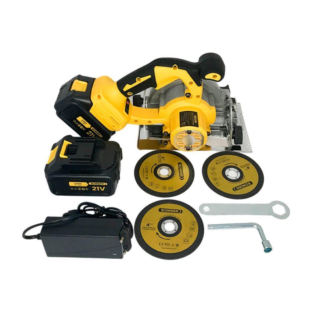 Serra Circular Portátil 3 Velocidades 2 Baterias 21v ProfiPode ser usada no corte de azulejos, chapas, plástico, madeira e etc. A Serra Circular, conta com 3 velocidades diferentes e ângulo de trabalho ajustável até 45°, além de punho auxiliar robusto, que proporciona maior estabilidade durante o corte.Informações Técnicas:Motor sem escovasBateria de lítio grau industrialTela metálica para póRolamentos de precisão duplaVelocidade regulável: 3 velocidadesÂngulo ajustável de 0 a 45°Diâmetro do disco: 125mmProfundidade ajustávelItens Inclusos:1x Serra Circular Portátil [21V]3x Lâminas de corte1x Chave para Porca1x Chave de Biela1x Carregador2x Baterias