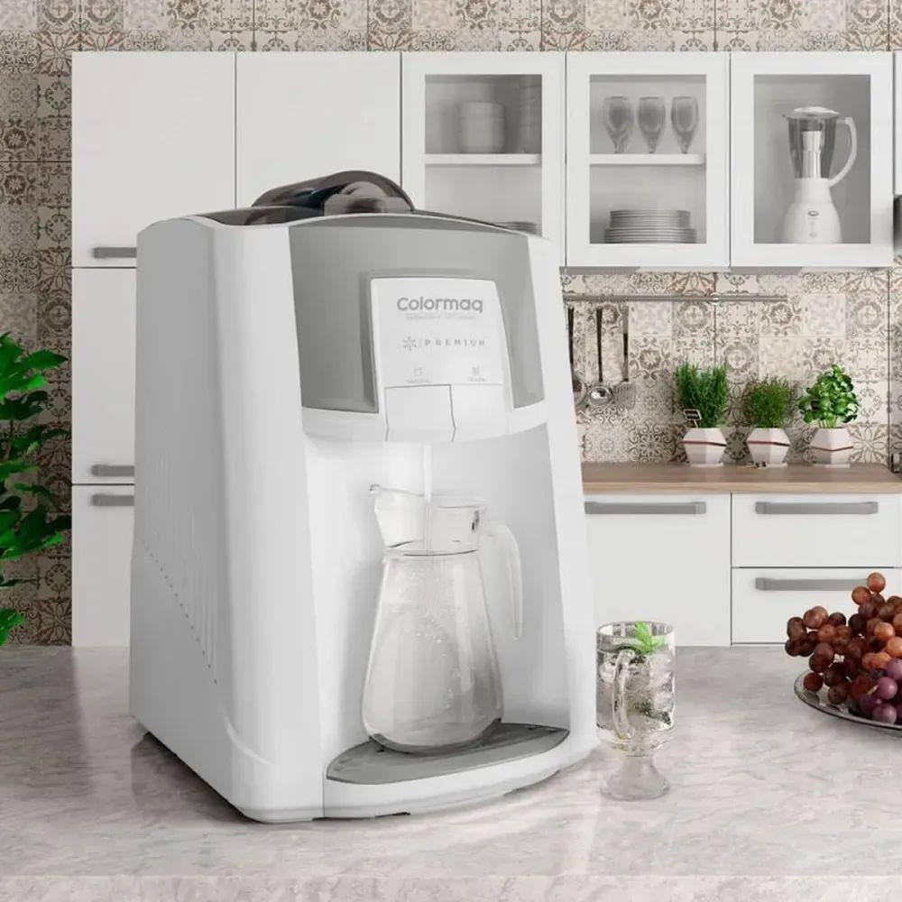 Purificador De Água Gelada E Natural Branco Colormaq 110VO Colormaq Purificador de Água Premium Compressor Gelada e Natural Branco 127V é um aparelho de alta qualidade, ideal para quem busca conveniência, eficiência e um design moderno para consumo de água. Ele oferece tanto água gelada quanto natural, sendo perfeito para diferentes necessidades de consumo em ambientes residenciais ou comerciais.Características:Modelo: Colormaq Purificador de Água Premium Compressor Gelada e NaturalVoltagem: 127VCapacidade do Reservatório: Possui uma capacidade de até 20 litros de água, o que garante um bom abastecimento de água gelada e natural.Temperatura da Água:Água Gelada: Refrigeração eficiente com compressor, garantindo água gelada com temperatura de até 5,5°C.Água Natural: Possui uma opção de saída de água natural para quando não for necessário resfriamento. Sistema de Refrigeração: Equipado com compressor, permitindo resfriamento rápido e eficiente da água para mantê-la na temperatura ideal.Design: O design moderno e elegante, na cor branca, permite que o purificador se adapte a diferentes ambientes de forma discreta e sofisticada.Galão Compatível: Aceita galões de até 20 litros, o que facilita o abastecimento de água de acordo com a preferência do usuário.Dimensões: Aproximadamente 40 cm de profundidade, 33 cm de largura, e 45 cm de altura, o que facilita a instalação em diversos espaços.Acessórios: O purificador acompanha uma jarra de 2 litros para facilitar o consumo imediato de água sem precisar abrir o reservatório.Certificações: Possui a aprovação do INMETRO, garantindo que o produto está em conformidade com os padrões de segurança e qualidade. Vantagens: Água Gelada e Natural: Oferece versatilidade, permitindo que o usuário escolha entre água gelada e natural conforme a necessidade.Refrigeração Rápida: O compressor de alta eficiência garante que a água fique gelada rapidamente.Design Moderno: O modelo compacto e elegante é adequado para qualquer tipo de ambiente, desde cozinhas até escritórios.Capacidade e Flexibilidade: Aceita galões de 20 litros e tem capacidade suficiente para fornecer água para diversas pessoas.Segurança: Certificado pelo INMETRO, garantindo segurança e qualidade no uso. Este Colormaq Purificador de Água Premium é uma excelente escolha para quem busca um produto eficiente, prático e com excelente custo-benefício, com a vantagem de oferecer tanto água gelada quanto natural.