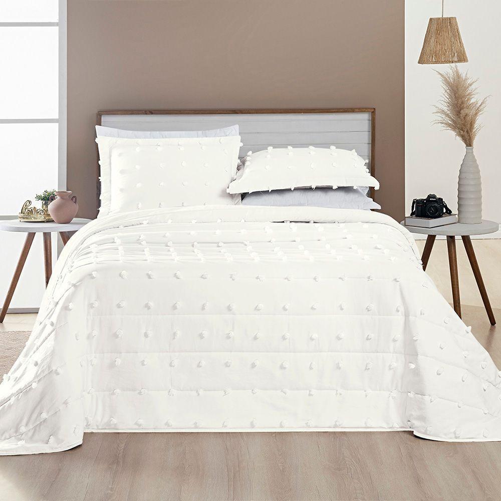 Cobre Leito Casal Padrão Poppy Micropercal 300 Fios Pompom 03 Peças 100% Poliéster - Off White