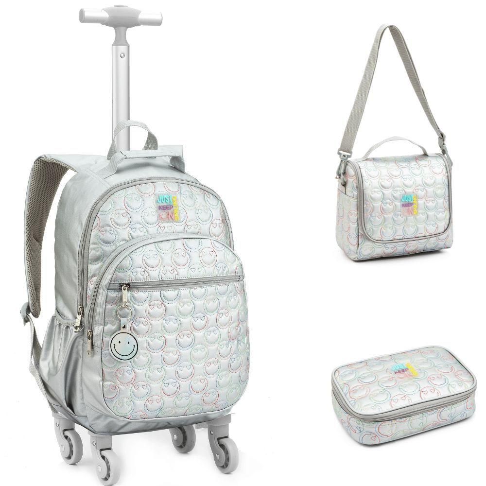 Kit Mochila De Rodinhas + Lancheira + Estojo Box Just Keep On Smiling Denlex Prata