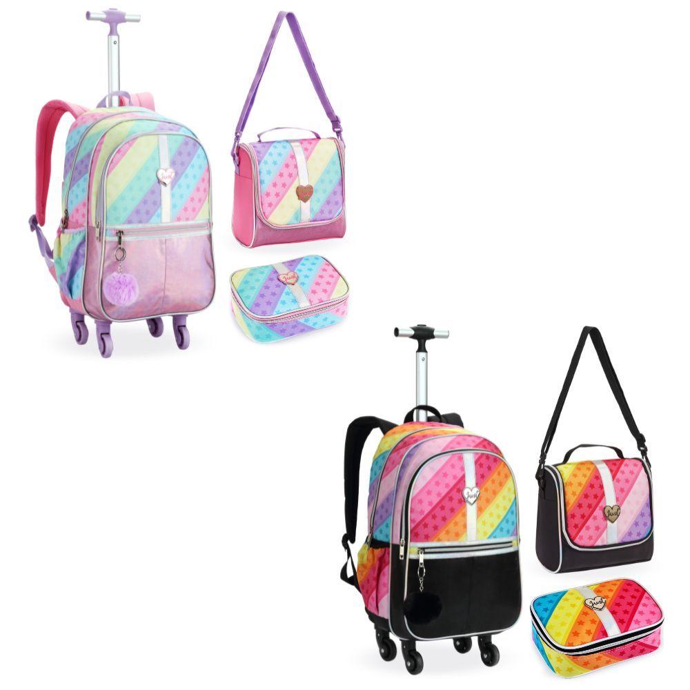 Kit Mochila De Rodinhas + Lancheira Térmica + Estojo Box Just Love Denlex Pastel
