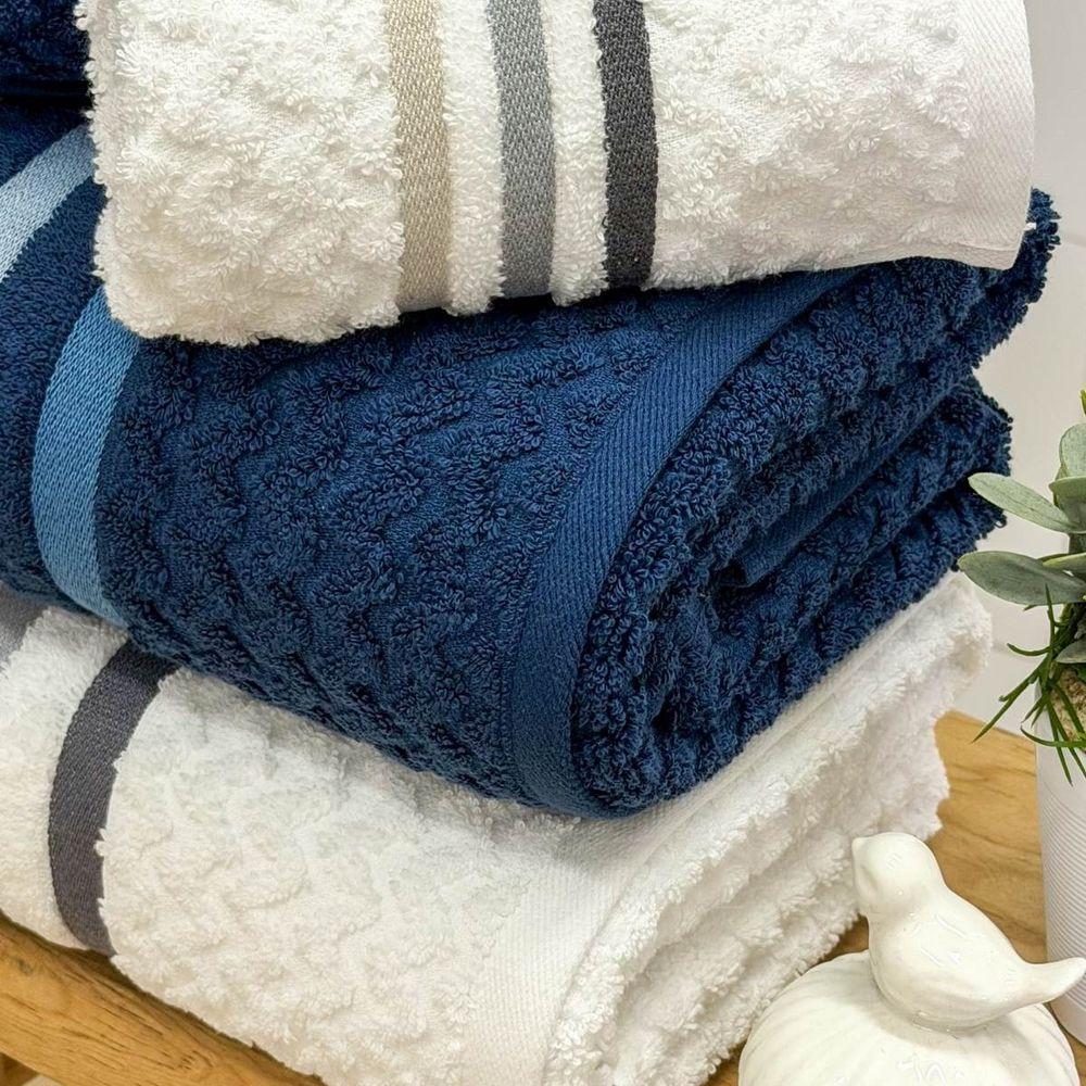 Jogo De Toalha Banhão Trento 4 Peças 100% Algodão Branco/azul MarinhoConforto e toque macio para sua rotinaO Jogo de Toalha Trento 4 peças foi pensado para quem busca conforto superior e um banho mais relaxante todos os dias. Composto por 2 toalhas de rosto (50x70cm) e 2 toalhas banhão (80x150cm), ele oferece versatilidade e bem-estar para o dia a dia. Produzidas com algodão de alta qualidade e 450g/m², as toalhas apresentam toque extremamente macio e textura aconchegante, proporcionando sensação de cuidado e suavidade desde o primeiro uso, como em um verdadeiro spa em casa.Alta absorção e design eleganteA textura especial da linha Trento garante alta absorção, secando a pele rapidamente e com suavidade, sem perder leveza ao manusear. Seu destaque fica por conta da barra trabalhada com acabamento sofisticado e das cores vibrantes que elevam o charme do ambiente. Moderno e elegante, o jogo Trento traz beleza e estilo para o seu banheiro, harmonizando com diferentes propostas de decoração.Durabilidade, praticidade e cuidado contínuoAlém do visual impecável, o Jogo Trento oferece excelente durabilidade e fácil manutenção, mantendo maciez, cor e formato mesmo após múltiplas lavagens. É uma escolha inteligente para quem deseja unir estética, desempenho e praticidade no enxoval. Com esse conjunto, você garante toalhas que continuam bonitas e eficientes por muito mais tempo.Composição: 100% algodãoGramatura: 450g/m²Contém: 2 Toalhas Banhão: 80cm x 150cm 2 Toalhas de Rosto: 50cm x 70cm
