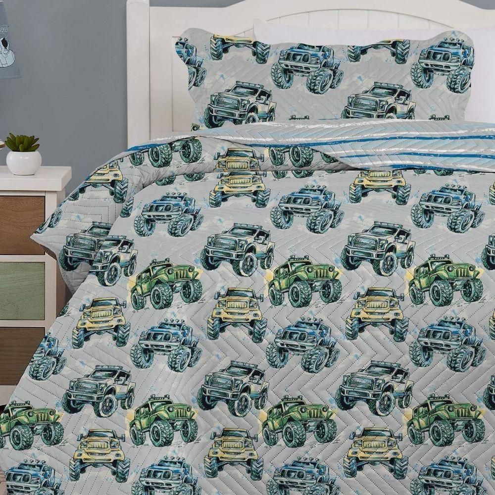 Kit Cobre Leito Solteiro Infantil + Porta Travesseiro RadicalCobre-Leito SolteiroConfeccionado com tecido microfibra, o Kit Colcha Patchwork Infantil Solteiro possui matelassê feito com a tecnologia Ultrasonic. Essa tecnologia é utilizada para matelassar colchas e cobreleitos através de calor, diferentemente do processo com costuras e linhas. Esse processo faz com que não haja problemas de desfiar a costura e deixa a colcha e o porta-travesseiro com uma cara moderna e elegante. A linha de Cobre Leitos é dupla face, cada modelo tendo uma estampa principal e uma estampa secundária, permitindo montar várias composições diferentes em sua cama com o mesmo produto.Colcha Infantil - você vai se apaixonar!O Kit Colcha Cobre-Leito Infantil é fabricado exclusivamente no tamanho solteiro e foram feitos pensando em uma composição alegre e divertido dos quartos de crianças e adolescentes, reunindo cores vibrantes e estampas divertidas. O Kit Colcha Cobre-Leito Infantil vem com uma com uma colcha e 1 porta-travesseiro em matelassê com estampa dupla face. As duas estampas deixam o quarto com um visual alegre e diferenciado, que liberta um sentimento de aconchego nos jovens.A coleção Infantil conta com uma grande variedade de estampas pensadas para encantar e decorar o quarto das crianças e jovens, tanto meninas quanto meninos, com o objetivo de transformar o ambiente em algo divertido e que estimule a criatividade das crianças e jovens.Contém: -1 Colcha Matelassada Solteiro 1,60m x 2,40m-1 Porta Travesseiro Matelassado 50cm x 70cm com AbaMarca: FatexComposição: -Tecido: 100% Poliéster-Enchimento: 100% Poliéster* Os produtos que acompanham a foto não estão inclusos.** As cores podem variar de acordo com as configurações do monitor