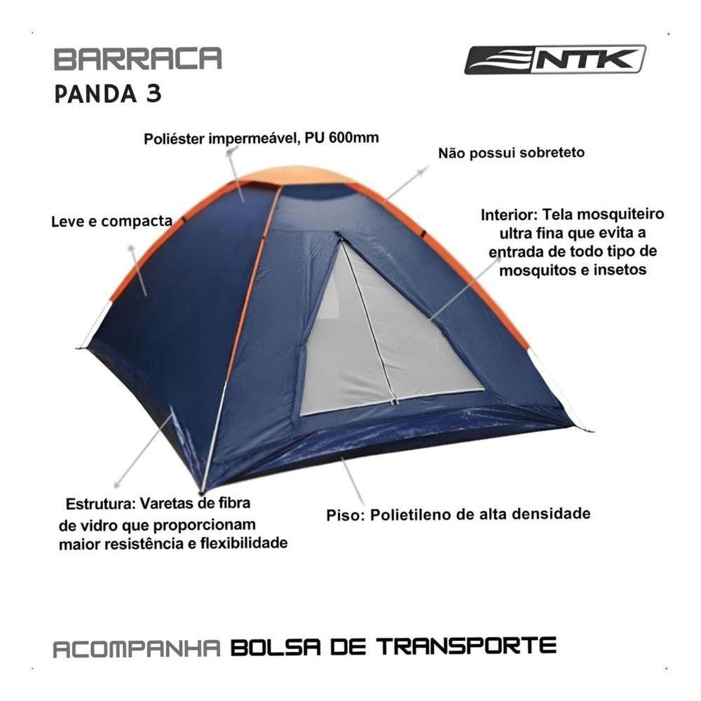Barraca Panda Iglu 3 Pessoas - AzulCompacta e prática, ideal para acampamentos em climas secos. Com capacidade para até 3 pessoas em sacos de dormir ou colchões, ela oferece conforto e proteção durante suas aventuras ao ar livre. Sua estrutura é composta por varetas de fibra de vidro interligadas por elástico interno com material 100% virgem, utilizando o sistema NANO-FLEX, que proporciona montagem rápida e estabilidade. O sobreteto é confeccionado em 100% poliéster com poliuretano, oferecendo resistência à água com uma coluna d'água de 600 mm. O piso é feito de polietileno de alta resistência e antifungos, garantindo durabilidade e proteção contra umidade. Internamente, a barraca possui tela mosquiteiro de poliéster No-see-um, que impede a entrada de insetos, permitindo boa ventilação sem comprometer a proteção. Além disso, conta com um bolso interno para organização de pequenos objetos. Fácil de transportar e montar, sendo perfeita para quem busca praticidade e conforto em suas atividades ao ar livre.Se desejar, posso adaptar essa descrição para uso em catálogos, anúncios ou embalagensEspecificações:Capacidade: 3 pessoasTipo: IgluMaterial do Sobreteto: 100% poliéster com poliuretanoColuna d’água: 600 mmMaterial do Piso: Polietileno de alta resistência com tratamento antifúngicoEstrutura: Varetas de fibra de vidro (NANO-FLEX)Mosquiteiro: Poliéster super fino (No-see-um)Dimensões: 2,05 m x 1,60 m x 1,15 m (C x L x A)Peso: 1,300 kgCor: Azul e LaranjaContém: 01 Barraca Panda Iglu 3 Pessoas - Azul