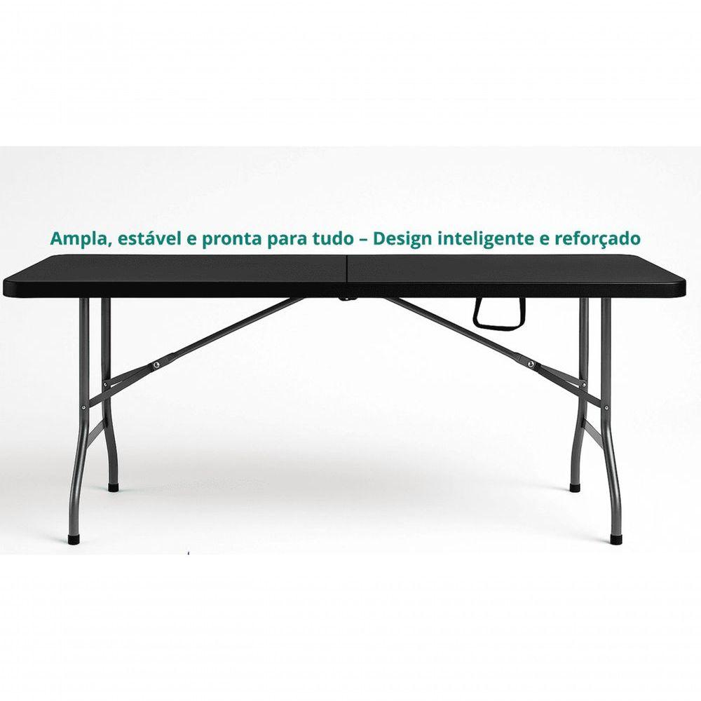 Mesa Dobrável Vira Maleta Com Alça Portátil 1,80m Camping PretaSolução prática, resistente e versátil para uso em ambientes externos e internos. Ideal para acampamentos, churrascos, eventos, feiras ou até mesmo como mesa auxiliar em casa, ela oferece uma estrutura robusta e grande área de apoio, sem abrir mão da facilidade de transporte e armazenamento. Produzida com tampo em polietileno de alta densidade, a mesa é durável, fácil de limpar e resistente a impactos. Sua estrutura metálica reforçada com pés antiderrapantes garante firmeza em diferentes tipos de terreno. O design dobrável permite que seja facilmente fechada e armazenada, ocupando pouco espaço e facilitando o transporte para qualquer lugar.Com capacidade para suportar até 100 kg distribuídos, é ideal para refeições, utensílios, equipamentos ou atividades diversas. Combinação perfeita entre funcionalidade, resistência e praticidade, indispensável para quem busca um item confiável e multifuncional em qualquer ocasião.Especificações:Dimensões: Aberta: 180 cm (comprimento) x 70 cm (largura) x 74 cm (altura)Fechada: 94 cm (comprimento) x 70 cm (largura) x 7,5 cm (altura)Peso: Aproximadamente 12 kgComposição: Tampo: Polietileno de alta densidade (HDPE), resistente e fácil de limparEstrutura: Aço com pintura epóxi anticorrosivaPés: Antiderrapantes, para maior estabilidadeCarga máxima suportada: 100 kg (distribuídos uniformemente)Cor: PretaContém:01 Mesa Dobrável Camping 180cm Preta