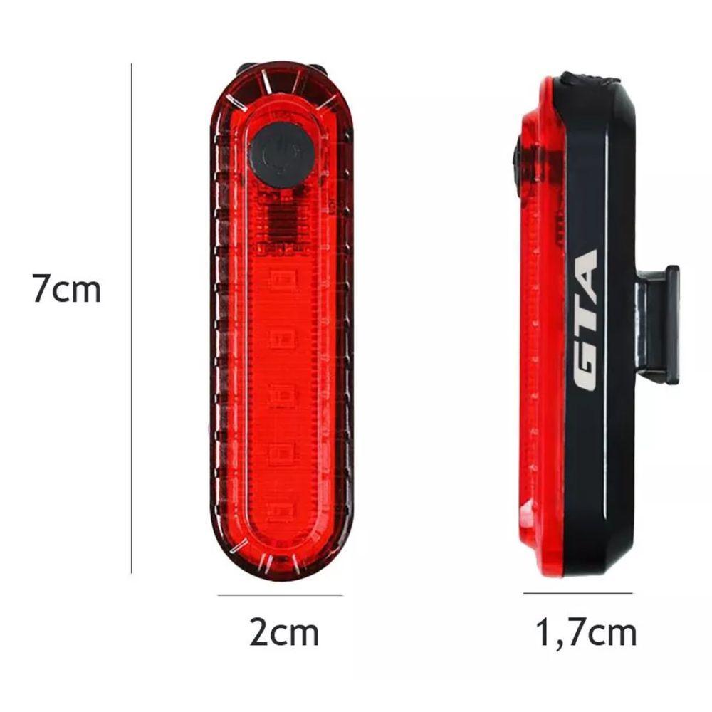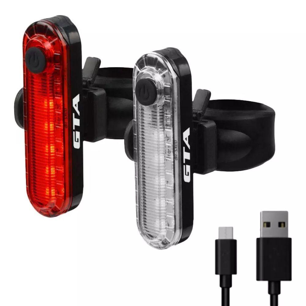Kit Sinalizador Gta Led Branco Dianteiro Vermelho TraseiroKit Sinalizador GTA LED Branco Dianteiro Vermelho Traseiro - pisca gta traseiro;Kit de Sinalizadores LED USBGaranta maior segurança no trânsito com o Kit de Sinalizadores LED USB, composto por um farol dianteiro de 20 lúmens na cor branca e um sinalizador traseiro de 10 lúmens na cor vermelha. Compacto, eficiente e fácil de instalar, é a escolha ideal para ciclistas que pedalam em ambientes urbanos ou com pouca luz.Iluminação Versátil e PotenteCada sinalizador oferece três modos de funcionamento: luz fixa (3h), sequencial (15h) e pulsante (6h), adaptando-se às suas necessidades e garantindo máxima visibilidade. A bateria recarregável de íons de lítio (550mAh) permite recargas rápidas em apenas 1 hora, através de cabo USB incluso.Design Resistente e PráticoFabricados com materiais de alta qualidade, como acrílico, silicone e bateria de li-poly, os sinalizadores são resistentes à água, suportando diferentes condições climáticas. O suporte integrado em silicone facilita a instalação em qualquer bicicleta.Características Gerais do Produto:- Bateria: Íons de lítio, 550mAh- USB: Sim- Quantidade de Lúmens: 20 (dianteiro branco), 10 (traseiro vermelho)- Modos de Luz: Fixa, sequencial, pulsante- Informações Importantes: Tempo de recarga: 1 hora; Resistência: À água;- Material: Acrílico, silicone, li-polyAcompanha o produto:- 1x Sinalizador LED dianteiro branco (20 lúmens)- 1x Sinalizador LED traseiro vermelho (10 lúmens)- 1x Cabo de recarga USB- 2x Suportes de fixação em siliconeGarantia:- 7 dias