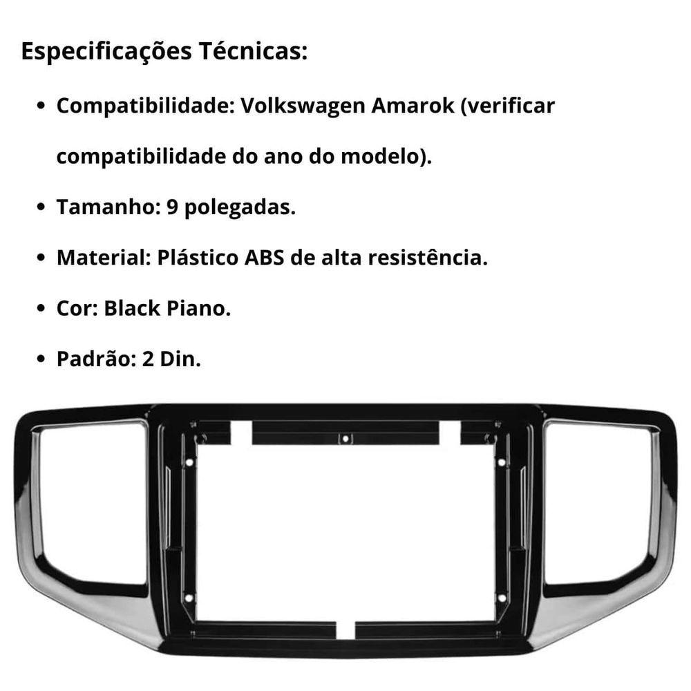 Central Multimídia Android 2 Din Amarok Moldura 9 Câmera Ré BpSOBRE O PRODUTO:Multimídia Android 9 Pol E-tech Premium Espelha Bt Cor PretoITENS INCLUSOS:Multimídia Android 9 Polegadas E-tech PremiumChicotes para instalaçãoManual do UsuárioCâmera de ré universal (Brinde)MolduraA Moldura 2 Din é fabricada com tecnologia de alta qualidade e proporciona um design com acabamento impecável para seu veículo. Pode ser utilizada com centrais multimídia, Dvd players 2 din. Seu painel vai ficar muito mais moderno! Acabamento impecável, encaixe perfeito e de fácil instalação/utilização.Veículos Compatíveis:- Amarok: Modelos fabricados a partir de 2017.Para mais detalhes sobre compatibilidade consulte instaladorA central multimídia Android 9 Pol E-tech Premium possui tela de 9 polegadas com alta resolução HD de 1024 x 600P. Desfrute de uma experiência multimídia completa com recursos como Bluetooth para músicas e chamadas, espelhamento para Android Auto e Apple CarPlay, 2 entradas USB, compatibilidade com Spotify e muito mais. Além disso, o sistema Android permite baixar seus aplicativos favoritos diretamente na tela da central.PRINCIPAIS CARACTERÍSTICAS:Tela IPS full Touch Screen capacitiva de 9 Polegadas com resolução HD de 1024 x 600P;Sistema Android 13 com processador Quad-Core 1.5 GHZ AHD;2GB de RAM + 32GB de Armazenamento FLASH EMMC;Função GPS (necessita instalação do mapa e internet roteada através do telefone celular);2 conexões USB traseiras;Conexão Wi-Fi e Bluetooth para ligações e músicas através de aparelhos celulares;Sistema DSP Digital Sound;7 cores de iluminação dos botões;NÃO possui leitor de CD/DVD;Espelhamento de celulares Android e IOS via USB e sem fio (Obs.: Para espelhar a tela de seu smartphone, é necessário baixar em seu celular o APP TiAVN, espelhamento compatível até Android 13 e Iphone 15);Conectividade com controles de som de volantes (consulte suporte do veículo);Entrada para câmera de estacionamento;Entrada auxiliar;Rádio FM com 18 memórias;Entrada para câmera frontal;1 saída de vídeo para tela sobressalente;Formatos de vídeos suportados: 3G2, ASF, AVI, DIVX, MKV, MOV, MP4, MPG, TS, WMV, VOB, WEBM, M4V, RMVB, FLV, H.264 e H.265;4 saídas a fio 4x60W, 4 saídas RCA e 1 saída para subwoofer.CARACTERÍSTICAS TÉCNICAS:Entretenimento a Bordo: A multimídia 9 Polegadas E-Tech PREMIUM proporciona entretenimento para motoristas e passageiros por meio de rádio, reprodução de músicas e vídeos;Conectividade Bluetooth: Permite que os motoristas conectem seus dispositivos móveis ao sistema do carro para fazer chamadas com viva-voz e reproduzir músicas;Integração de Smartphones: Suporta integração de smartphones, como Apple CarPlay e Android Auto, para acesso a aplicativos e funções do telefone. Um sistema multimídia para carros oferece uma variedade de soluções e recursos para melhorar a experiência de condução e entretenimento dentro do veículo.A Loja recomenda que a instalação seja feita por profissional especializado e não se responsabiliza pelo mau uso do produto.Garantia do vendedor: 3 meses
