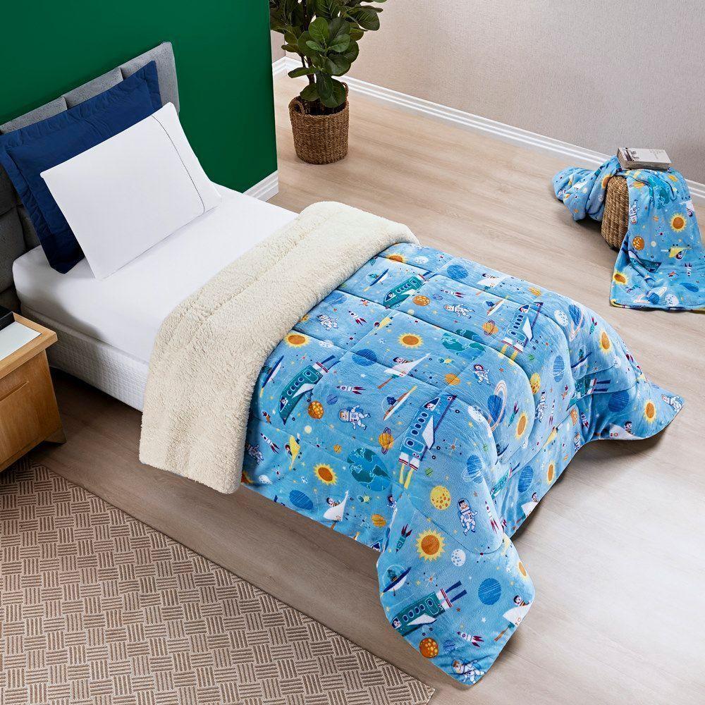 Kit Coberdrom + Jogo De Cama Bouti Kids Solteiro 04 Peças 100% Poliéster - Astronauta