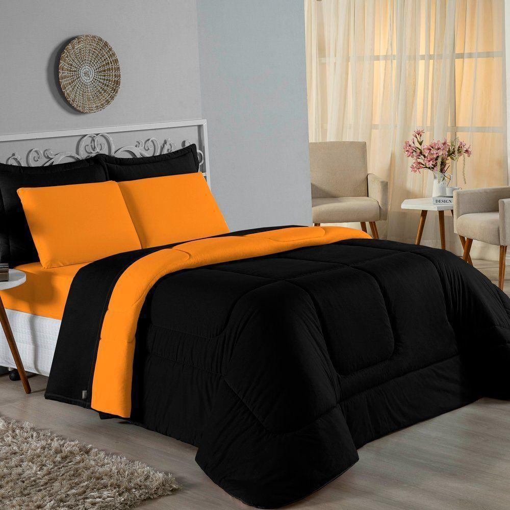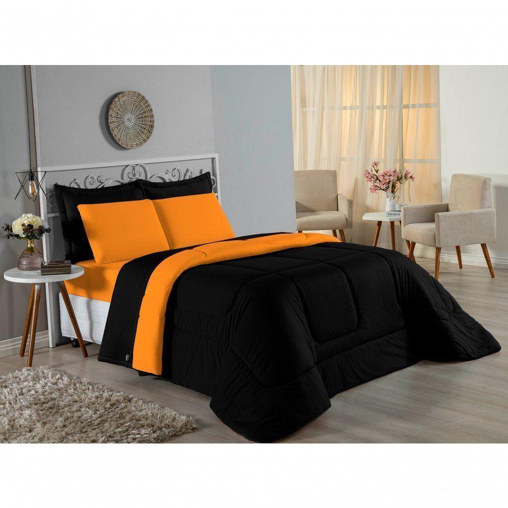 Edredom Solteiro Nobre 1 Peça Dupla Face 1,60m X 2,40m Malha 100% Algodão - Preto / Laranja