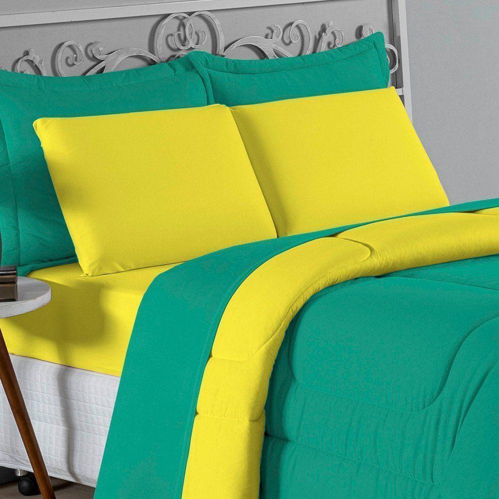 Kit Edredom Dupla Face + Jogo De Lençol Casal Nobre 7 Peças Malha 100% Algodão - Jade / Amarelo